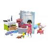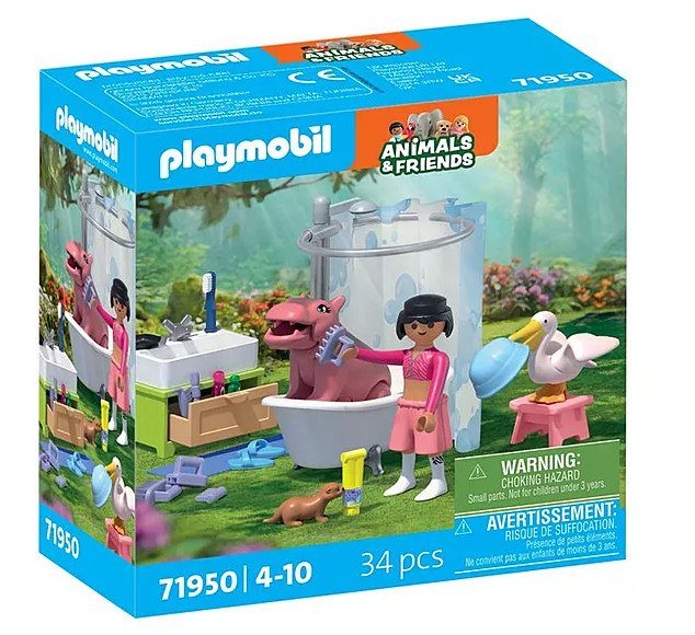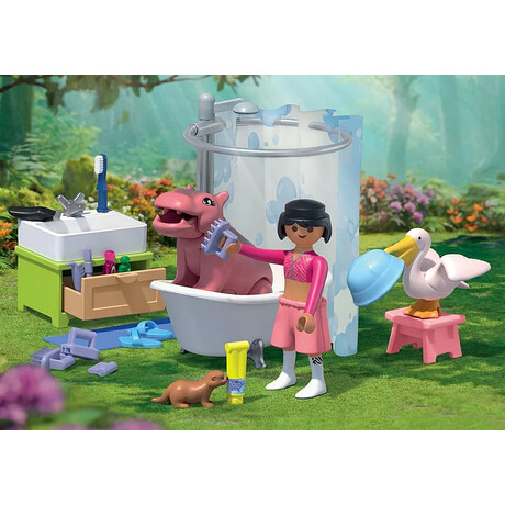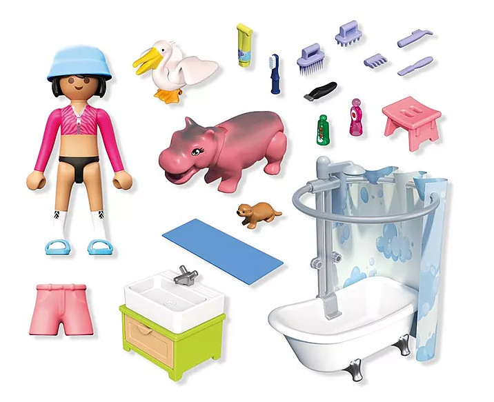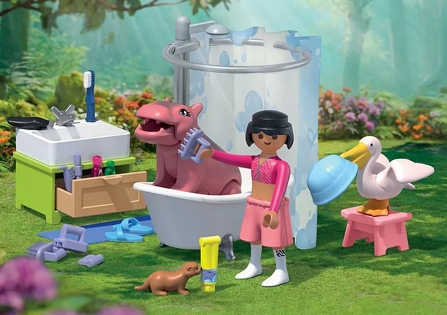 Μέρα μπάνιου με τα Ζώα & Φίλους! Το χαριτωμένο μωρό ιπποπόταμος απολαμβάνει το ζεστό νερό στην μπανιέρα και του καθαρίζουν σχολαστικά την πλάτη οι φίλοι των ζώων. Το μικρό μωρό ασβός και ο πελεκάνος περιμένουν ανυπόμονα τη σειρά τους για να πηδήξουν στη μπανιέρα. Το σετ έρχεται με πολλά αξεσουάρ, όπως σαμπουάν, σαπούνι, βούρτσες και πετσέτα, και μπορεί να ενσωματωθεί υπέροχα είτε στο εσωτερικό είτε στο εξωτερικό της βίλας των ζώων.