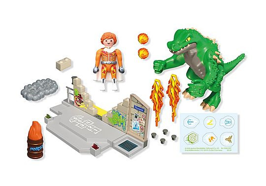 PLAYMOBIL Heroes: MegaRaptor εναντίον Firestormer – Μάχη ηρώων γεμάτη δράση! Στην PLAYMOPOLIS γίνεται η απόλυτη τελική αναμέτρηση: Η γιγαντιαία σαύρα MegaRaptor προσφέρει εντυπωσιακή δράση με την εντυπωσιακή λειτουργία χτυπήματος στο δεξί χέρι και τη λειτουργία συγκράτησης στο αριστερό χέρι. Μπορεί να συγκρατεί στο στόμα της τις φιγούρες ή να τις πιάνει και να τις κρατάει με το χέρι της. Ο τοίχος που μπορεί να καταστραφεί φέρνει πρόσθετη διασκέδαση – μπορεί να χτιστεί ξανά και ξανά και να κατεδαφιστεί εντυπωσιακά από τη γιγαντιαία σαύρα. Στο πλευρό των ηρώων βρίσκεται ο Firestormer: Με τις αφαιρούμενες πύρινες σφαίρες του και την ευμετάβλητη έκφραση του προσώπου του, είναι έτοιμος να μπει στη μάχη και να υπερασπιστεί την PLAYMOPOLIS.