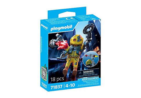 PLAYMOBIL Heroes: Mr. Mechanic – Ο ρομποτικός ήρωας Ένας από τους τέσσερις συλλεκτικούς ήρωες της σειράς PLAYMOBIL Heroes, με τους οποίους μπορείς να διευρύνεις τις μάχες σου με ήρωες και καθάρματα! Ο κυβερνοεφευρέτης και ρομποτικός ήρωας Mr. Mechanic εντυπωσιάζει με τον εξωσκελετό του και δύο ισχυρούς ρομποτικούς βραχίονες. Με το αφαιρούμενο όπλο του στο χέρι, μπορεί να εκτοξεύει βέλη πυραύλων και έτσι να περνάει αβίαστα από εμπόδια ή αντιπάλους. Το εντυπωσιακό κράνος του αποκαλύπτει το εντυπωσιακό μάτι του cyborg – ένα σύμβολο της ασταμάτητης θέλησής του να κυριαρχήσει στην PLAYMOPOLIS.