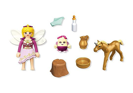 Ένα χρυσό θαύμα έφτασε στο Βασίλειο των Μονόκερων! Με λαμπερά μάτια και ασημένιο τρίχωμα, το Χρυσό πουλάρι φροντίζεται με αγάπη από τη νεράιδα και τo βοηθό της, τo Joyling. Αυτό το όμορφο σετ PLAYMOBIL διαθέτει μαγευτικά αξεσουάρ όπως κανάτα, μπουκάλι γάλακτος και λαμπερά φτερά νεράιδας. Ιδανικό για αφήγηση και μαγευτικό παιχνίδι, τα παιδιά μπορούν να δημιουργήσουν τις δικές τους παραμυθένιες περιπέτειες με αυτό το μαγικό σετ PLAYMOBIL!