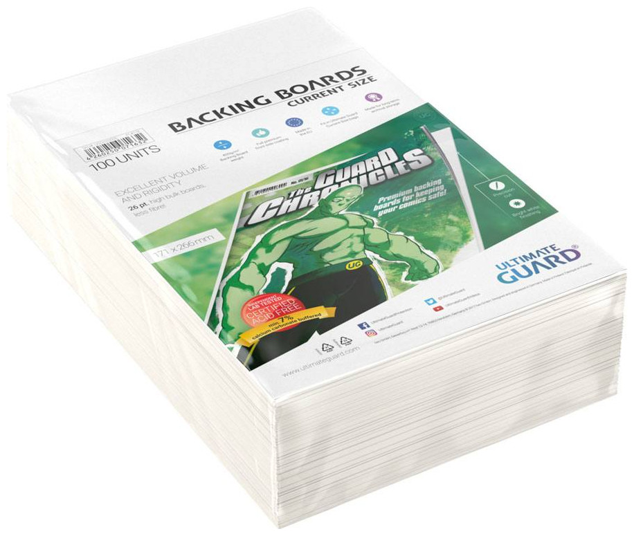 - 100% certified acid free - Excellent volume and rigidity - Min. 26 pt. high bulk boards, less fibre - Min 7% calcium carbonate buffered - Full high quality front side coating - Precision cut & bright white finishing - Backing Board dimensions: 171 x 266 mm - 400 g/m² Backing Board weight - Made for long-term archival storage - Fits Ultimate Guard Current Size bags (UGD020002 & UGD020008)