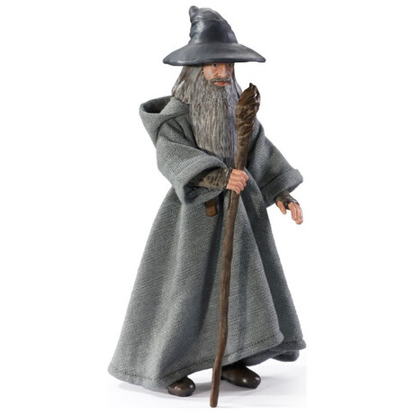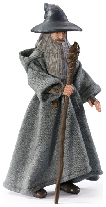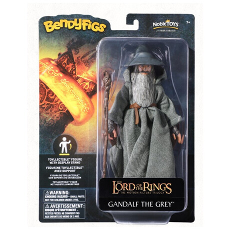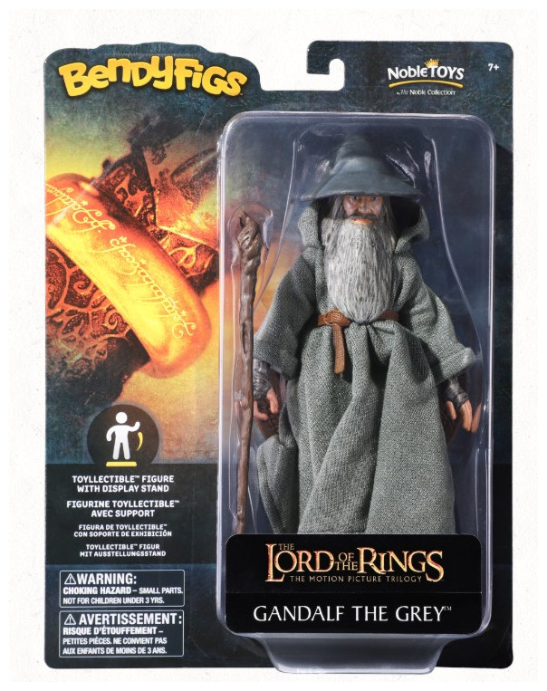 Each fully posable figure stands approximately 7.5 inches in height. Each comes on a circular stand emblazoned with the Ring rhyme and with accessories particular to each character. Gandalf in cloth robes with his staff, Frodo in a cloth cape, carrying Sting and Gollum with a fish.