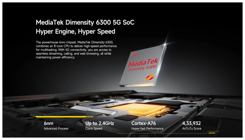 Επεξεργαστής: MediaTek Dimensity 6300 (6nm), οκταπύρηνος (2x2.4GHz Cortex-A76 & 6x2.0GHz Cortex-A55).