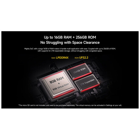 Μνήμη: 8GB RAM (επεκτάσιμη με 8GB εικονικής RAM), 256GB εσωτερική αποθήκευση UFS 2.2, υποδοχή microSD έως 2TB.