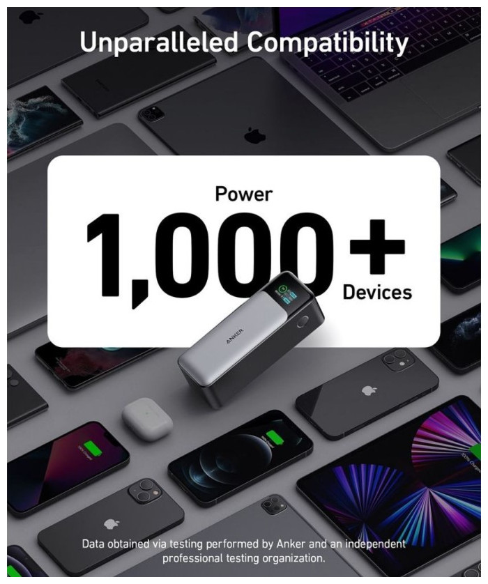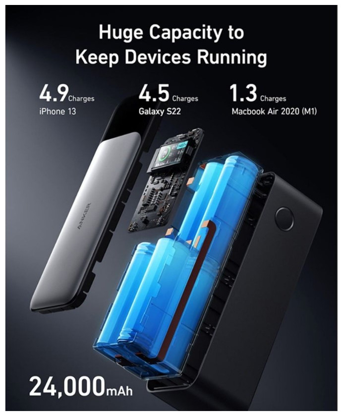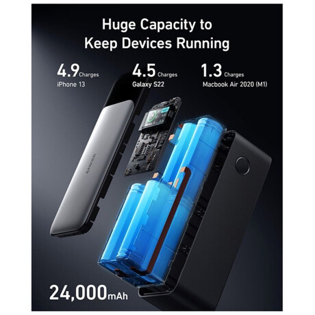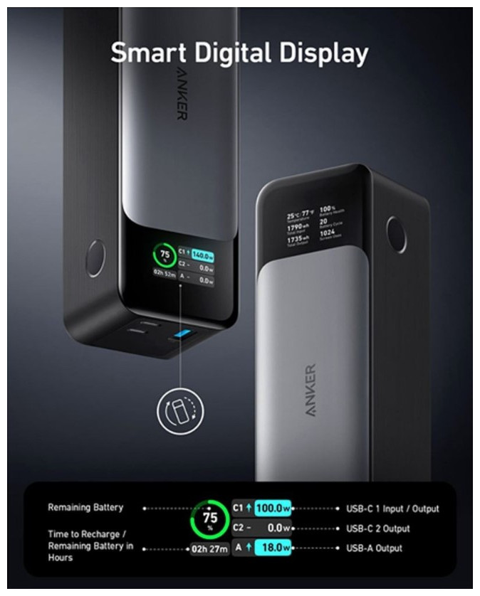 Η Anker 737 Power Bank, γνωστή και ως PowerCore 24K, είναι μια στιβαρή φορητή μπαταρία υψηλής απόδοσης με χωρητικότητα 24.000 mAh. Διαθέτει τεχνολογία Power Delivery 3.1 με μέγιστη ισχύ 140 W, καθιστώντας την κατάλληλη για φόρτιση φορητών υπολογιστών, tablet και smartphones. Έχει ενσωματωμένη περιστρεφόμενη έγχρωμη οθόνη για ενημέρωση σε πραγματικό χρόνο της φόρτισης και του χρόνου, ενώ υποστηρίζει την τεχνολογία ActiveShield 2.0 για ασφαλή διαχείριση θερμοκρασίας.