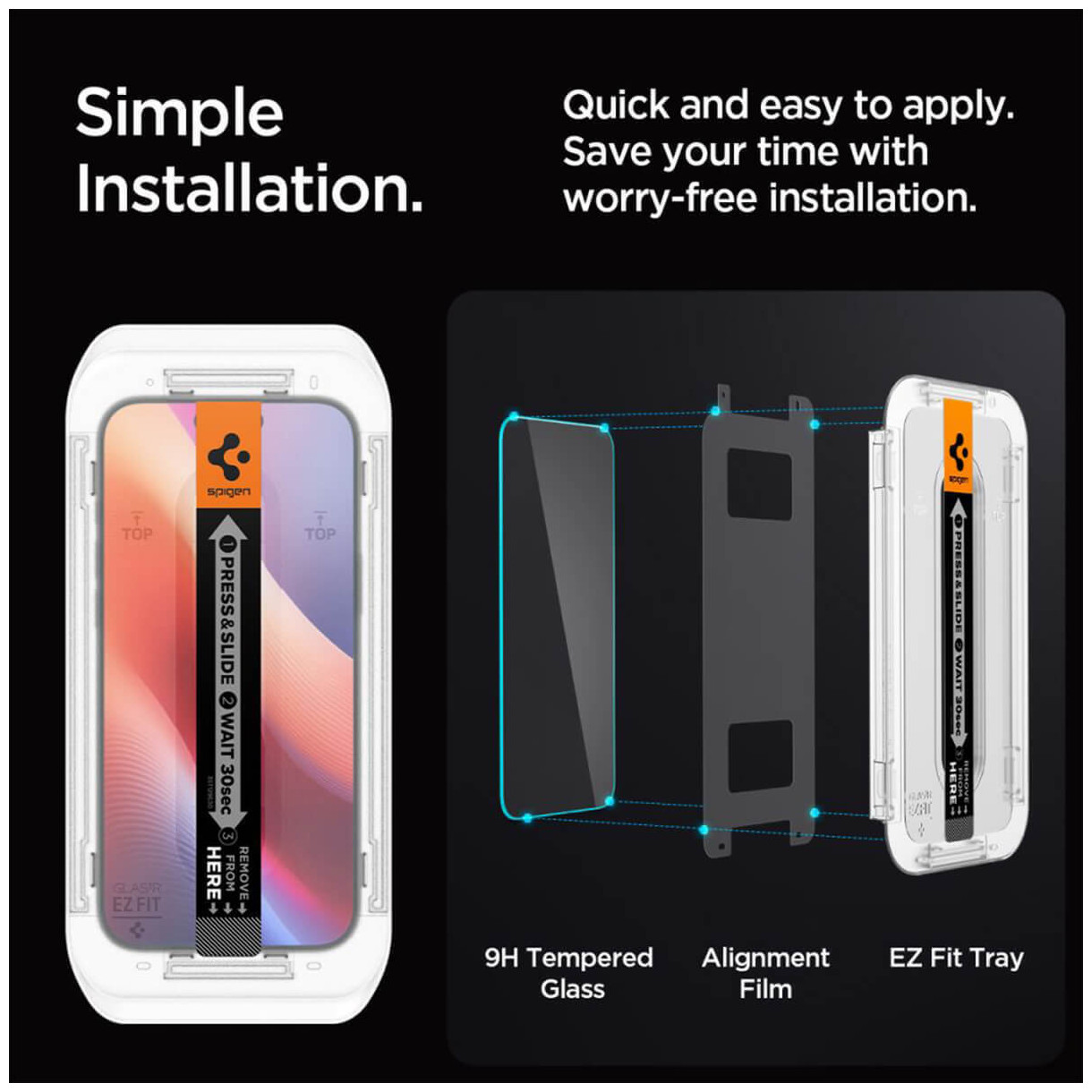 Το EZ Fit σας επιτρέπει να εγκαταστήσετε ένα προστατευτικό οθόνης στην οθόνη του iPhone 16 Pro Max σας όπως ποτέ άλλοτε. Χρησιμοποιήστε το πλαίσιο για να ευθυγραμμίσετε το προστατευτικό οθόνης στο iPhone σας, πατήστε προς τα κάτω και είστε έτοιμοι. Το κάνει εύκολα.