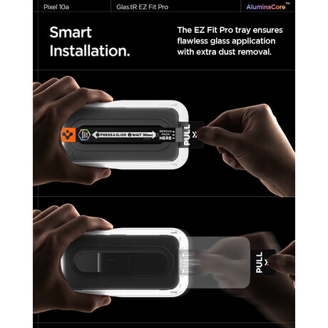 Το ειδικό σύστημα εγκατάστασης EZ Fit περιλαμβάνει πρακτικό πλαίσιο τοποθέτησης που ευθυγραμμίζει τέλεια το προστατευτικό με την οθόνη του Pixel 10a. Με απλή πίεση, αφαίρεση της μεμβράνης και ελάχιστα βήματα, η εγκατάσταση γίνεται γρήγορα και χωρίς φυσαλίδες. Η ελαιοφοβική επίστρωση μειώνει τα δαχτυλικά αποτυπώματα και διατηρεί την οθόνη καθαρή, ενώ η νέα μεμβράνη απελευθέρωσης βοηθά στην αυτόματη απομάκρυνση της σκόνης κατά την τοποθέτηση.