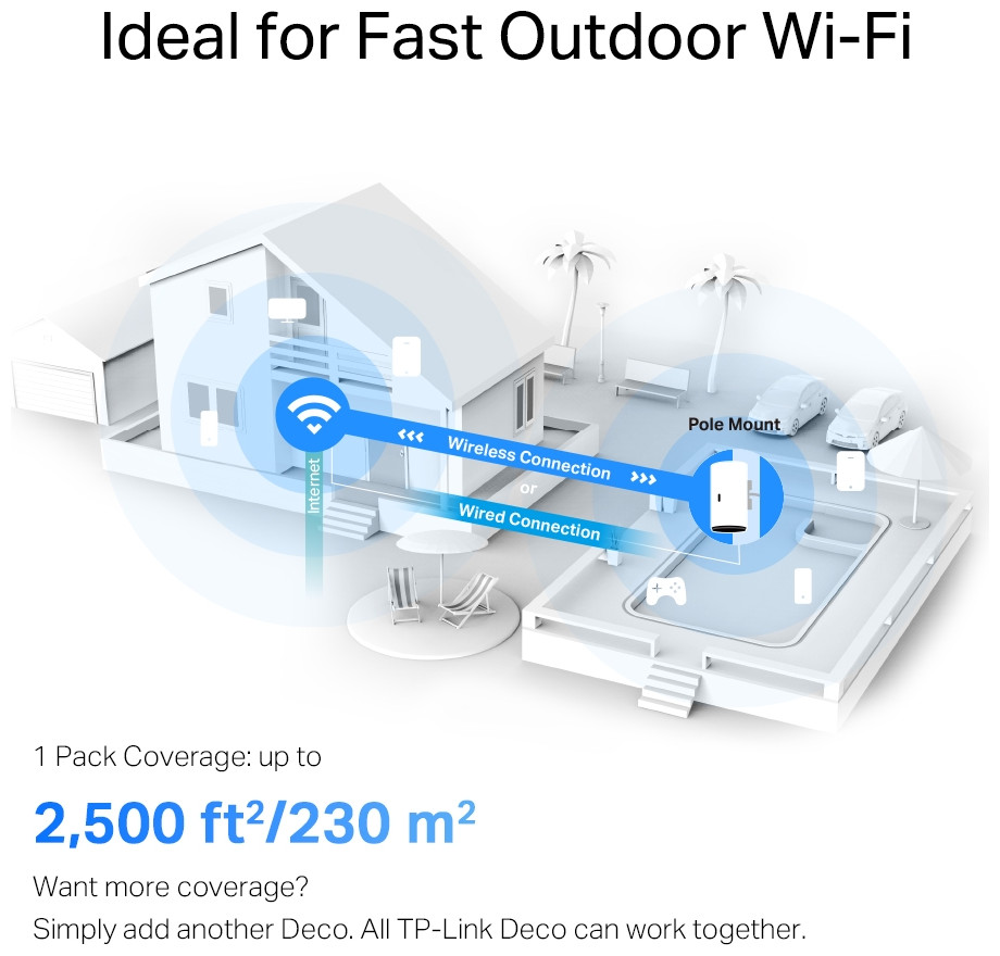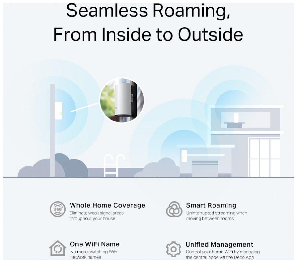• Λειτουργία σε εξωτερικό χώρο - Κορυφαία στον κλάδο IP65 αντοχή στη σκόνη και το νερό IP65. Το Deco X50-Outdoor διαθέτει αδιάβροχο περίβλημα και σταθερή θερμοκρασία λειτουργίας, επιτρέποντας ισχυρά σήματα Wi-Fi εξωτερικά. Η ευέλικτη εγκατάσταση και η παροχή ρεύματος καθιστούν ακόμα πιο εύκολη την εξωτερική χρήση.