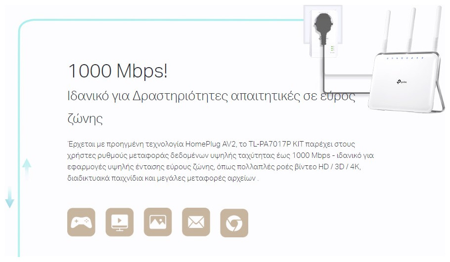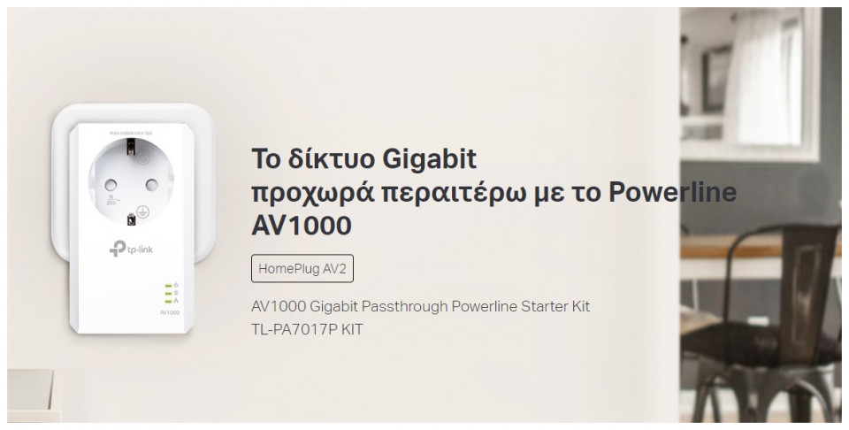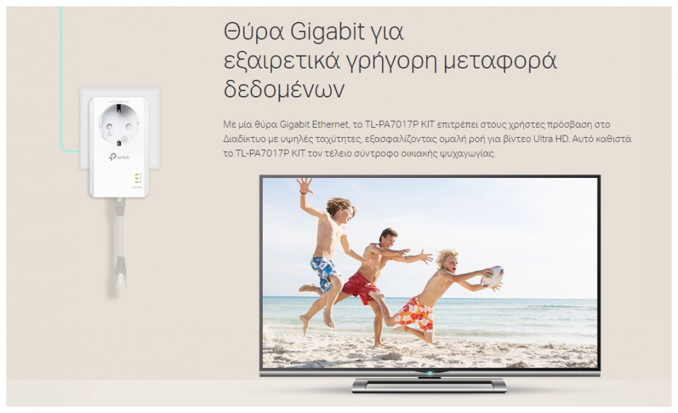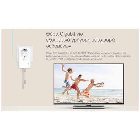 - Με μία θύρα Gigabit Ethernet, το TL-PA7017P KIT επιτρέπει στους χρήστες πρόσβαση στο Διαδίκτυο με υψηλές ταχύτητες, εξασφαλίζοντας ομαλή ροή για βίντεο Ultra HD. Αυτό καθιστά το TL-PA7017P KIT τον τέλειο σύντροφο οικιακής ψυχαγωγίας.