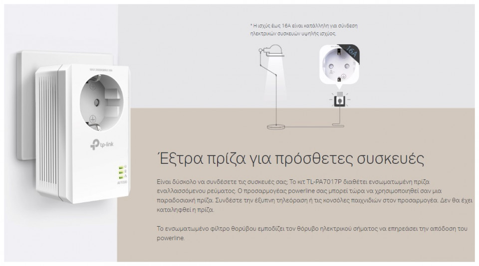 Είναι δύσκολο να συνδέσετε τις συσκευές σας; Το κιτ TL-PA7017P διαθέτει ενσωματωμένη πρίζα εναλλασσόμενου ρεύματος. Ο προσαρμογέας powerline σας μπορεί τώρα να χρησιμοποιηθεί σαν μια παραδοσιακή πρίζα. Συνδέστε την έξυπνη τηλεόραση ή τις κονσόλες παιχνιδιών στον προσαρμογέα. Δεν θα έχει καταληφθεί η πρίζα.
