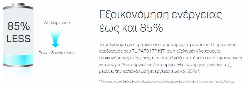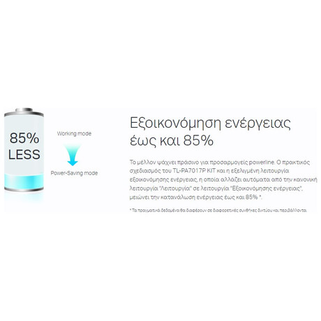Το μέλλον ψάχνει πράσινο για προσαρμογείς powerline. Ο πρακτικός σχεδιασμός του TL-PA7017P KIT και η εξελιγμένη λειτουργία εξοικονόμησης ενέργειας, η οποία αλλάζει αυτόματα από την κανονική λειτουργία "Λειτουργία" σε λειτουργία "Εξοικονόμησης ενέργειας", μειώνει την κατανάλωση ενέργειας έως και 85% *.