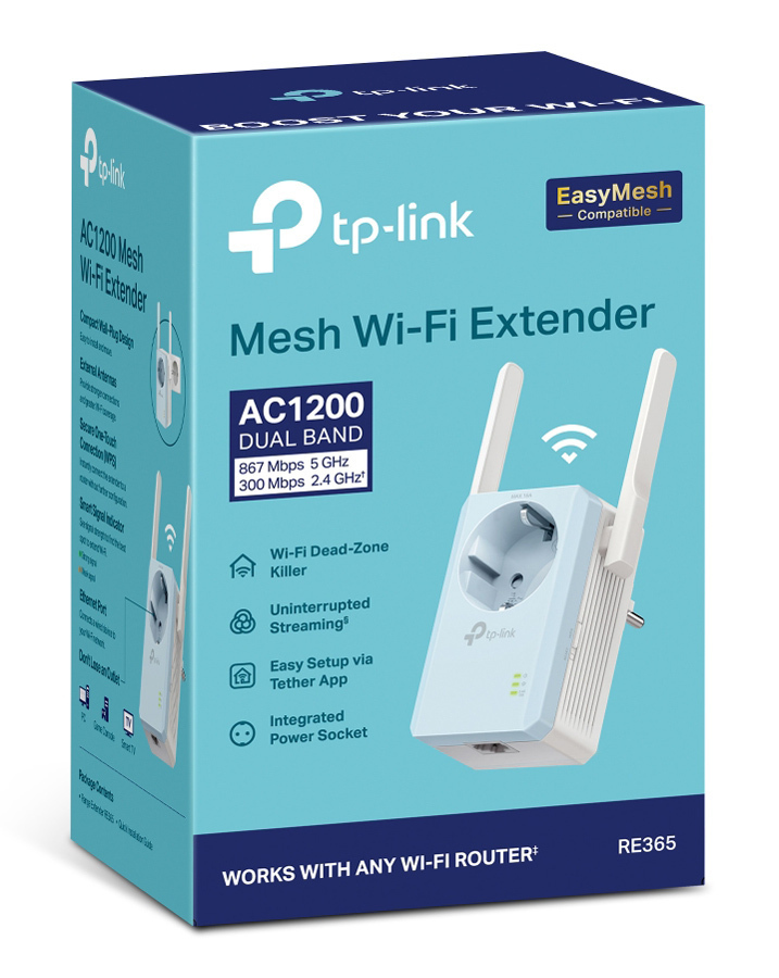 Ο TP-LINK RE365 είναι ένας WiFi extender / repeater διπλής ζώνης (2,4 GHz + 5 GHz) με συνολική ταχύτητα έως 1,2 Gbps (300 Mbps στη ζώνη 2,4 GHz + 867 Mbps στη ζώνη 5 GHz).