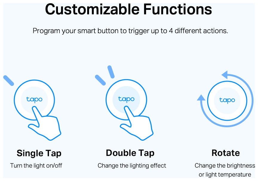 Έξυπνες ενέργειες – Ελέγξτε και ρυθμίστε πολλαπλά φώτα, ηλεκτρονικά και άλλες έξυπνες συσκευές Tapo με το κουμπί. Μην μπείτε στον κόπο να ανοίξετε μια εφαρμογή ή να καλέσετε τον φωνητικό βοηθό σας. Απλώς κάντε κλικ στο κουμπί και απολαύστε έναν πιο γρήγορο και ευκολότερο τρόπο ελέγχου των έξυπνων φώτων σας. Τοποθετήστε δύο ή περισσότερα κουμπιά σε διαφορετικό μέρος, έτσι ώστε ο έλεγχος φωτισμού σας να είναι πάντα προσβάσιμος.