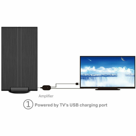 Κεραία τηλεόρασης με ενισχυτή 28 dB, για εσωτερικό χώρο ή εξωτερικό, που μπορείτε να τοποθετήσετε εύκολα στον τοίχο ή το παράθυρο και να βελτιώσετε τη λήψη της τηλεόρασής σας. Λαμβάνει σήματα UHF / VHF / FM. Εύκολη σύνδεση κυρίως σε εξωτερικό χώρο. Ταυτόχρονα, μπορεί να τροφοδοτείται με ρεύμα από USB ώστε να μπορείτε να την συνδέσετε απευθείας με τον αποκωδικοποιητή σας, την τηλεόρασή σας ή απλό φορτιστή USB.