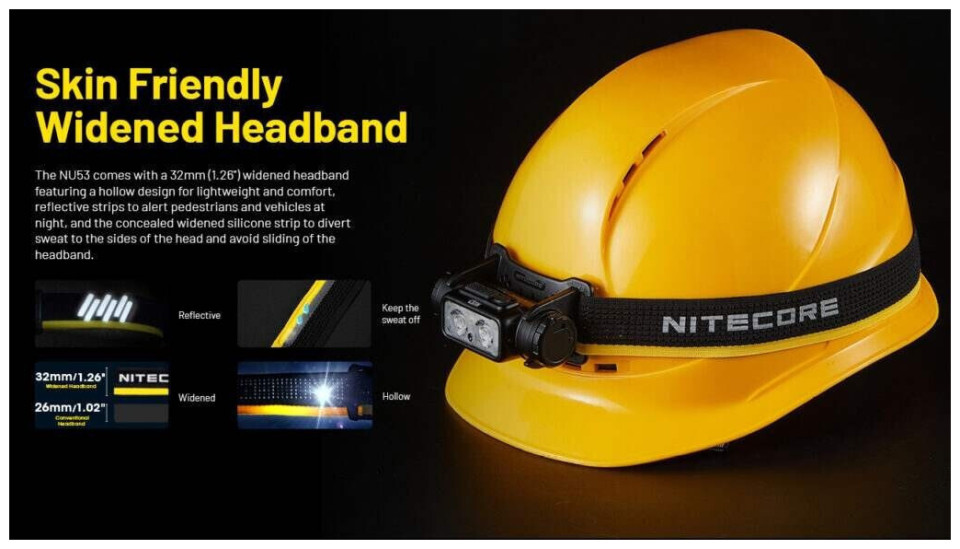 Ο φακός κεφαλής NITECORE NU53 διαθέτει έναν φαρδύ ιμάντα κεφαλής 32mm με διάτρητο σχεδιασμό για χαμηλό βάρος και άνεση, με αντανακλαστικές λωρίδες για να προειδοποιεί τους πεζούς και τα οχήματα τη νύχτα και με κρυφή διευρυμένη λωρίδα σιλικόνης για την εκτροπή του ιδρώτα στα πλάγια του κεφαλιού και την αποφυγή της ολίσθησης του από το κεφάλι.