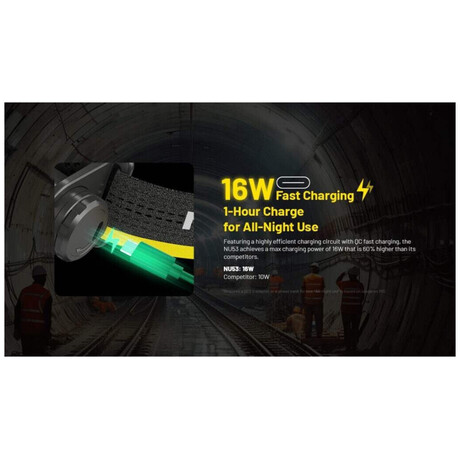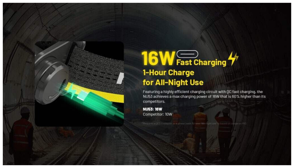Διαθέτοντας ένα εξαιρετικά αποδοτικό κύκλωμα φόρτισης με γρήγορη φόρτιση QC, ο φακός κεφαλής NITECORE NU53 επιτυγχάνει μέγιστη ισχύ φόρτισης 16W, η οποία είναι 60% υψηλότερη από την αντίστοιχη του ανταγωνισμού.