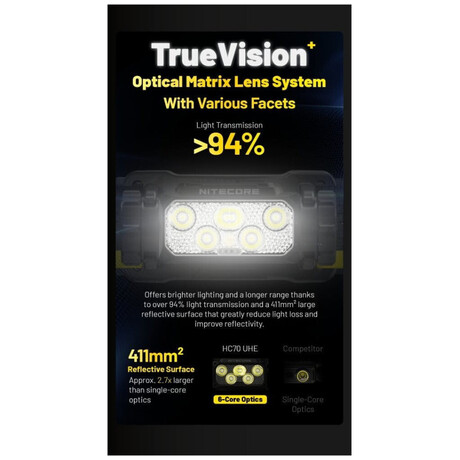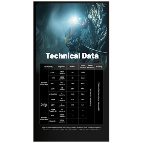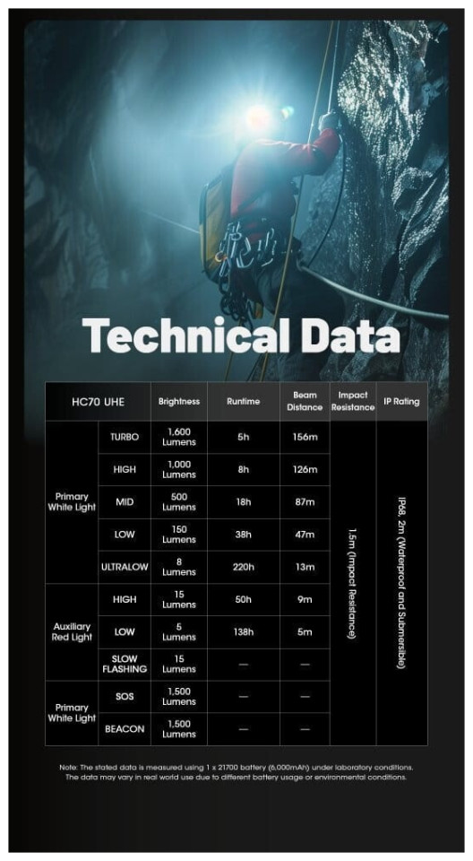 Επαναφορτιζόμενος Φακός Κεφαλής LED HC70 UHE Αδιάβροχος IP68 με Μέγιστη Φωτεινότητα 1600lm Μαύρος