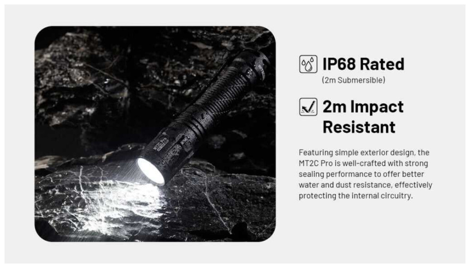 Επιχειρησιακός φακός MT2C Pro της Nitecore, με δύο επίπεδα φωτεινότητας, σχεδιασμένος να προσφέρει κορυφαία απόδοση σε μικρό μέγεθος. Εξοπλισμένος με το αναβαθμισμένο LED UHi 20, ο φακός αυτός προσφέρει εντυπωσιακή φωτεινότητα 1800 lumens και απίστευτη μέγιστη απόσταση δέσμης 520 μέτρα. Eίναι κατάλληλος για επιχειρησιακή χρήση, χάρη στην επαναφορτιζόμενη μπαταρία 18650 με ενσωματωμένη θύρα Type-C που προσφέρει πρακτικότητα και ευκολία. Ταυτόχρονα, παρέχεται η ευελιξία να λειτουργήσει ο φακός και με την χρήση δύο 2 μπαταριών CR123 μίας χρήσης (δεν περιλαμβάνονται). Με μήκος μόλις 117,5mm και βάρος 114g (συμπεριλαμβανομένης της μπαταρίας), ο φακός αυτός χωράει άνετα στην τσέπη σας ή στο σακίδιο σας, καθιστώντας τον ιδανικό για φορητότητα.