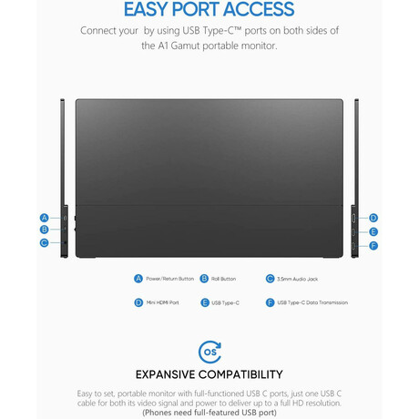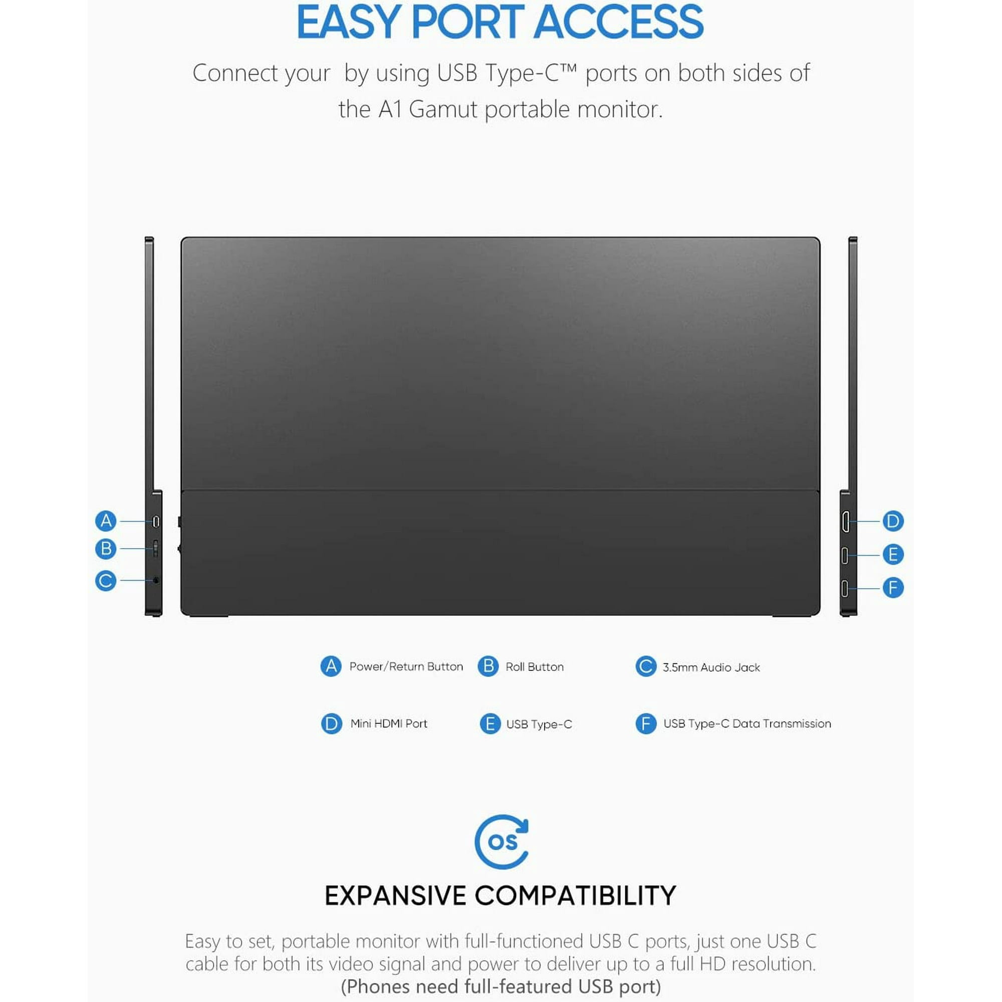 With plug-and-play functionality via USB-C or HDMI, the A1 Gamut requires no drivers or external power adapters, making setup fast and effortless. Whether you are working remotely, gaming on the go, or streaming content, this portable monitor provides a reliable and high-quality viewing experience.