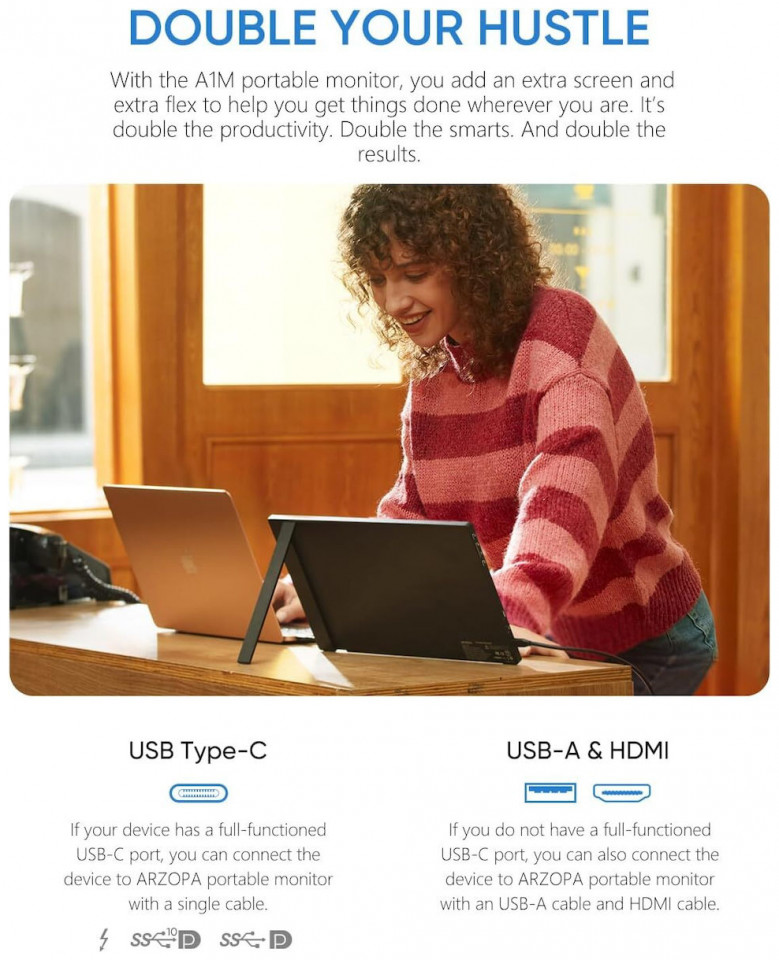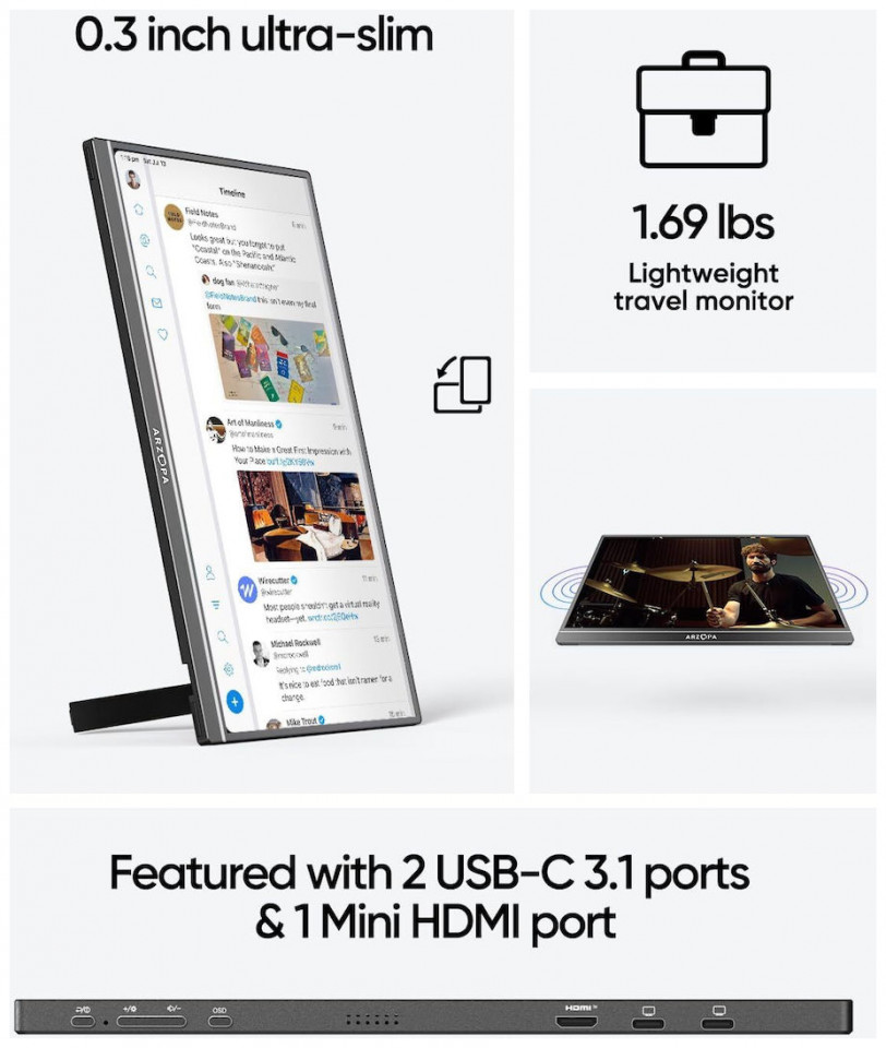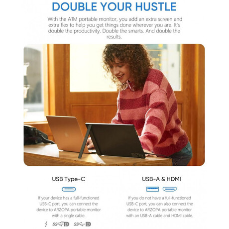 Τα προβλήματα συμβατότητας ανήκουν στο παρελθόν! H Arzopa A1 M προσφέρει πολλές διαφορετικές θύρες. Διαθέτει θύρα mini HDMI και USB-C, που σας επιτρέπουν να συνδέεστε απρόσκοπτα σε φορητό υπολογιστή, tablet ή ακόμα και κονσόλα παιχνιδιών. Mια υποδοχή 3,5 mm σάς επιτρέπει να συνδέσετε εξωτερικά ηχεία ή ακουστικά. Μπορείτε εύκολα να συνδέσετε το MacBook, το φορητό υπολογιστή Lenovo Yoga, το smartphone Samsung, κονσόλα και πολλά άλλα!