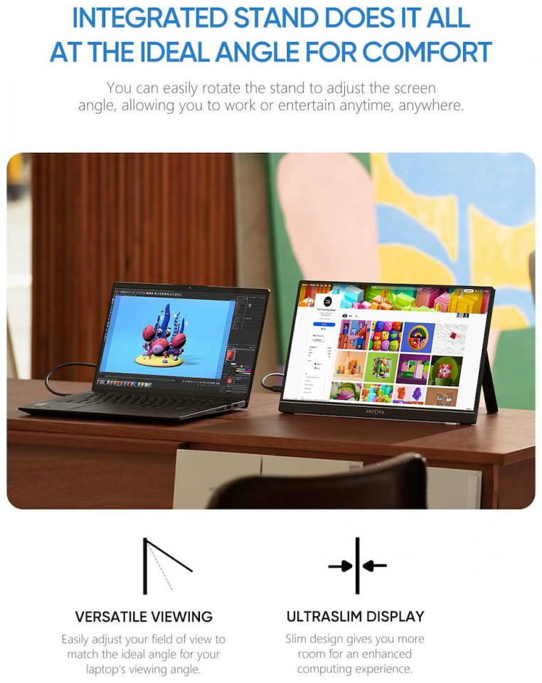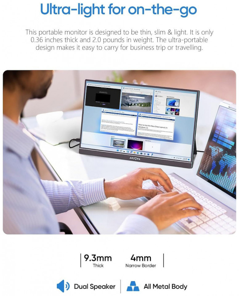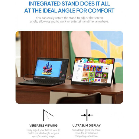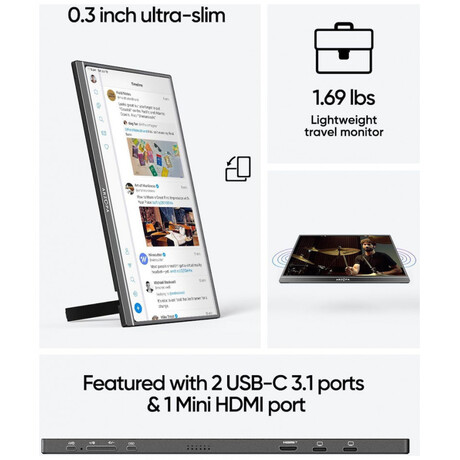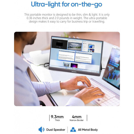 Η φορητή οθόνη εντυπωσιάζει όχι μόνο με τη φανταστική ποιότητα και λειτουργικότητα εικόνας, αλλά και με τη στιβαρή κατασκευή της. Κατασκευασμένη από κράμα αλουμινίου, η οθόνη είναι ελαφριά και εξαιρετικά ανθεκτική - ιδανική τόσο για καθημερινή χρήση όσο και για ταξίδια. Μπορείτε να το τοποθετήσετε κατακόρυφα και οριζόντια, προσαρμόζοντάς το στις προτιμήσεις και το στυλ εργασίας σας και η ευρεία γωνία θέασης 178° εξασφαλίζει σταθερή εικόνα και εξαιρετική αναπαραγωγή χρωμάτων, ανεξάρτητα από τη γωνία που κοιτάτε στην οθόνη.