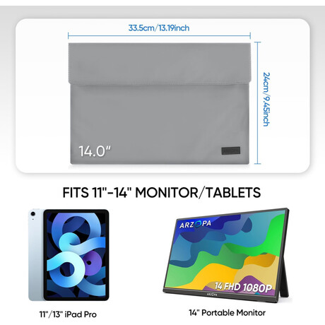The ARZOPA 14" Portable Monitor Sleeve Bag in grey is a premium protective case designed for portable monitors and tablets up to 14.0 inches. Made from high-quality water-resistant PU leather with a soft inner lining, it effectively protects your device from scratches, dust, and light moisture. Its slim and lightweight design allows it to be carried on its own or easily placed inside a backpack, briefcase, or suitcase, making it ideal for work, school, and travel.