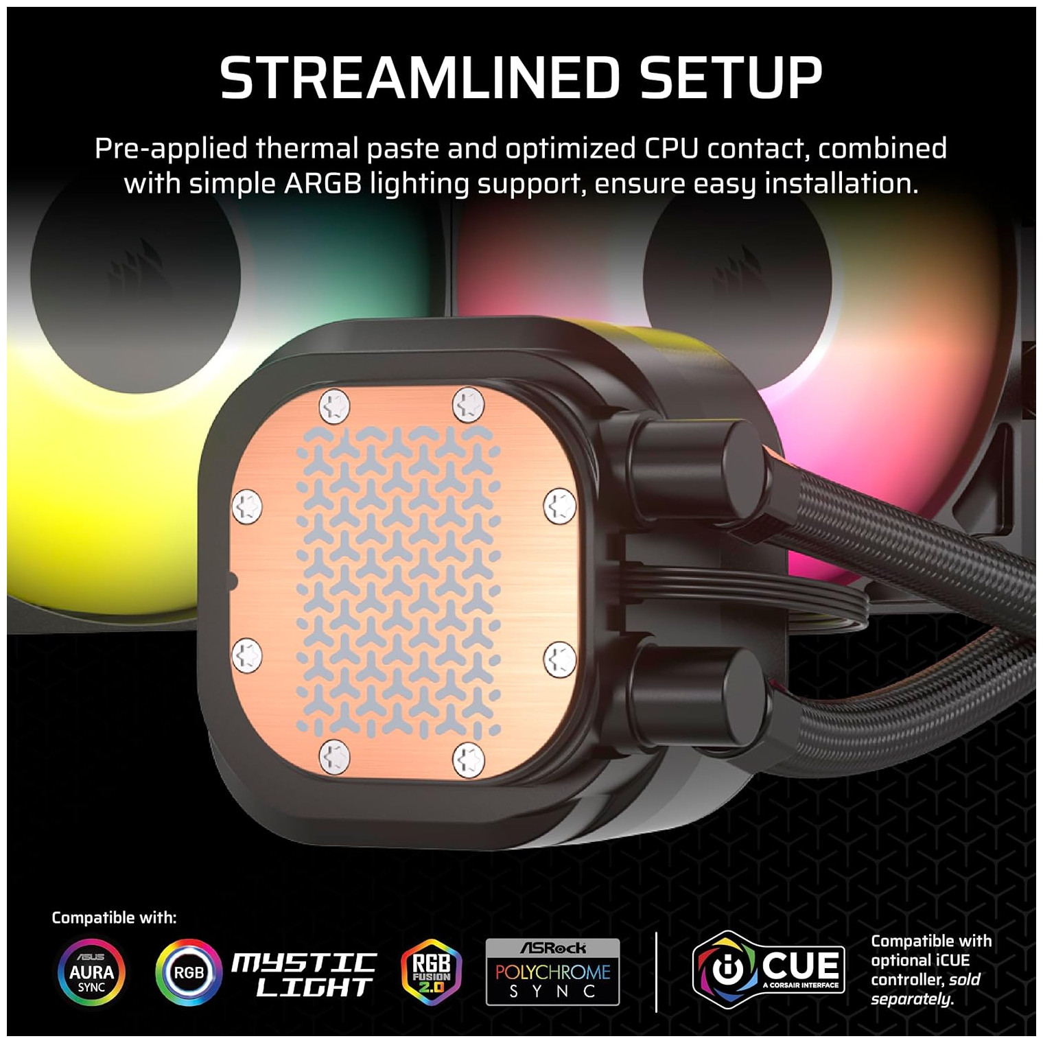 The CORSAIR NAUTILUS RS ARGB Liquid CPU Cooler delivers efficient, low-noise cooling with straightforward connectivity – no controller required, just plugs directly into your motherboard.