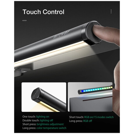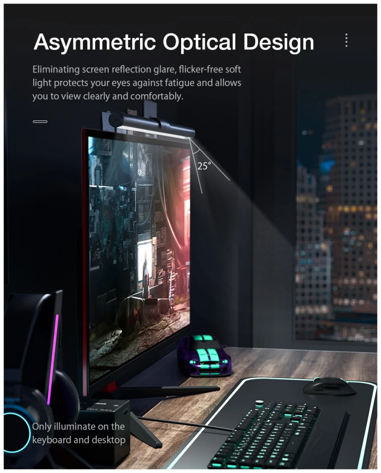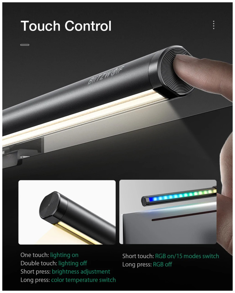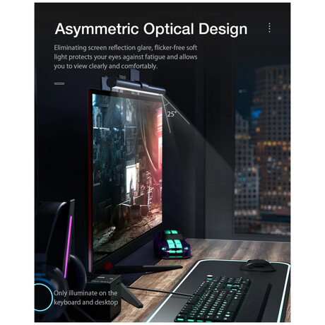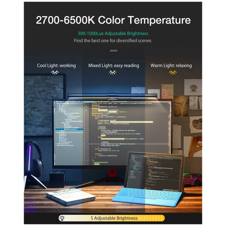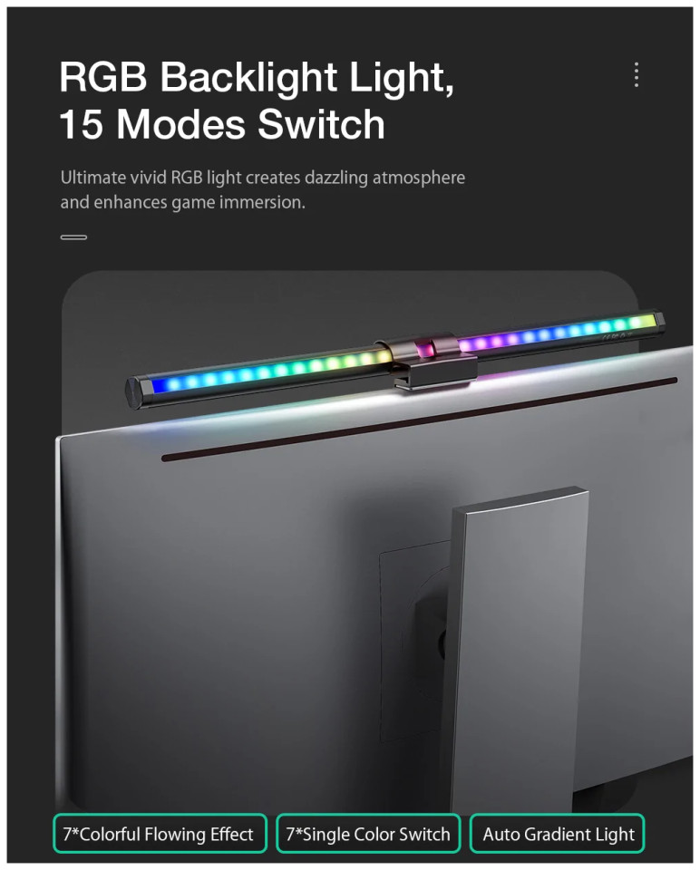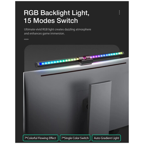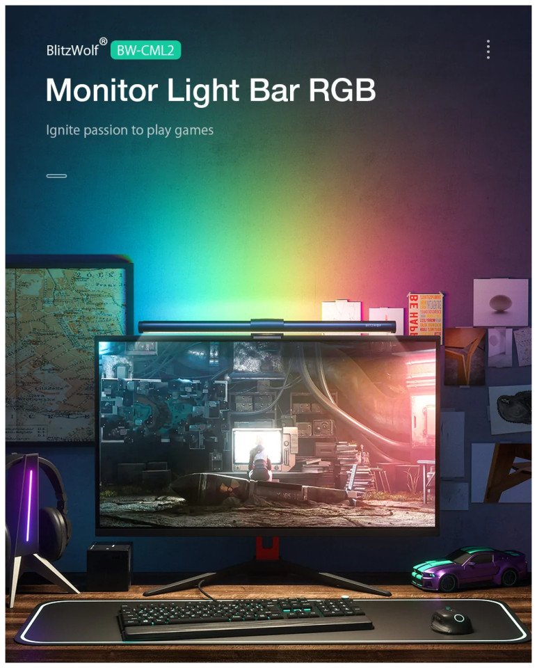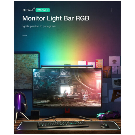 Το BlitzWolf BW-CML2 είναι μια προηγμένη μπάρα φωτισμού για οθόνες, σχεδιασμένη για να προστατεύει τα μάτια και να βελτιώνει την εμπειρία χρήσης του υπολογιστή. Εξοπλισμένο με ρυθμιζόμενο θερμό και ψυχρό φωτισμό καθώς και 15 εφέ RGB οπίσθιου φωτισμού, δημιουργεί ιδανική ατμόσφαιρα για εργασία, παιχνίδι ή χαλάρωση. Η ασύμμετρη κατανομή του φωτός μειώνει την αντανάκλαση και εστιάζει στον φωτισμό της επιφάνειας εργασίας. Η τροφοδοσία γίνεται μέσω USB και η εγκατάσταση είναι εύκολη με μαγνητική στήριξη.