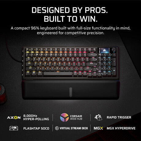 Η στιβαρή double-rail κατασκευή, ο compact σχεδιασμός 96%, και το hyper-polling στα 8.000Hz εξασφαλίζουν επαγγελματική σταθερότητα και ακαριαία καταγραφή εντολών. Χάρη στο CORSAIR Web Hub, μπορείς να προσαρμόζεις το keyboard χωρίς εγκατάσταση software — ιδανικό για gamers, streamers και power users που θέλουν απόδοση χωρίς όρια.