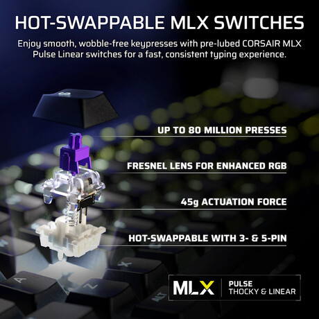 | Switches | Corsair MLX Pulse Linear (pre‑lubed, hot‑swappable) |