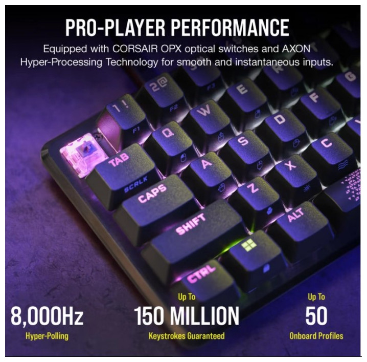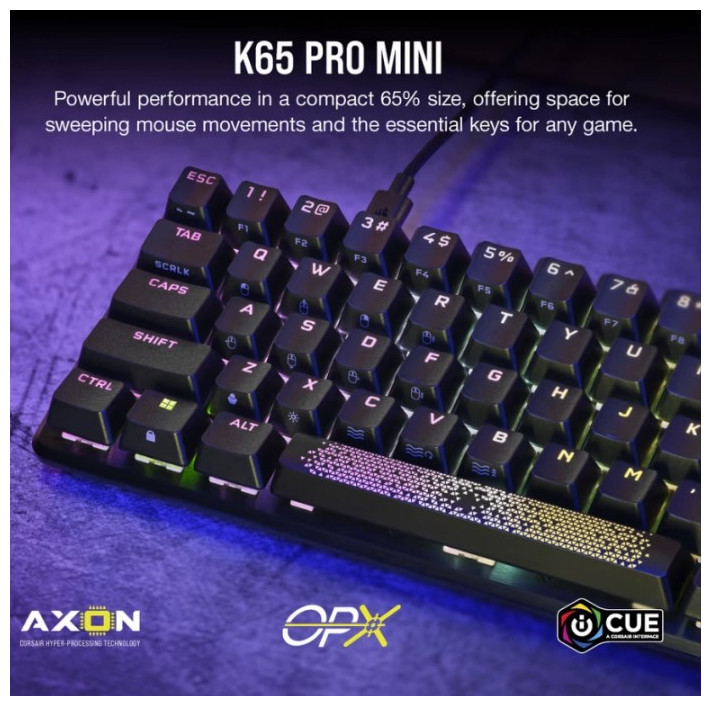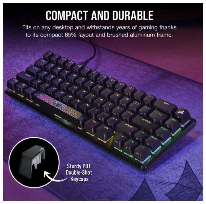 Η απόδοση των επαγγελματιών παικτών έρχεται σε μέγεθος 65% που εξοικονομεί χώρο. Οι οπτικοί διακόπτες CORSAIR OPX συνδυάζονται με ικανοποιητική ακουστική για να εστιάσετε σε αυτό που πραγματικά έχει σημασία: το παιχνίδι.