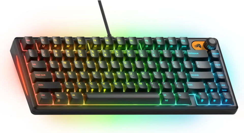 The Glorious GMBK 75% is a wired, highly customizable gaming keyboard in a compact 75% layout with American US QWERTY layout. It features a robust build with IP57 waterproof and dust-resistant rating, 10-zone RGB lighting, and keycaps, cables and knob all swappable to suit your style. It uses quiet gaming switches rated for up to 20 million keystrokes. With the reduced footprint compared to TKL, it gives more mouse pad space without sacrificing essential keys — ideal for gamers who want performance and customization in one.