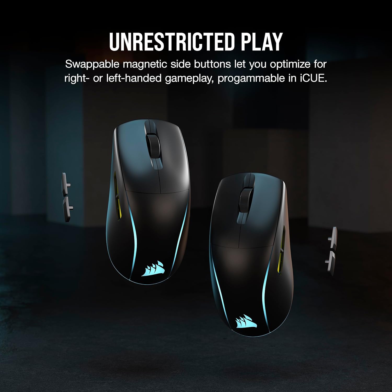 Υποστηρίζει ασύρματη σύνδεση μέσω Slipstream Wireless για ultra-low latency gaming, καθώς και Bluetooth για μεγαλύτερη ευελιξία. Ο RGB φωτισμός είναι πλήρως παραμετροποιήσιμος μέσω του λογισμικού iCUE, ενώ τα μαγνητικά, εναλλάξιμα πλευρικά κουμπιά επιτρέπουν διαμόρφωση ανάλογα με το στυλ παιχνιδιού σας. Με μεγάλη αυτονομία μπαταρίας, αποτελεί ιδανική επιλογή για competitive gaming.