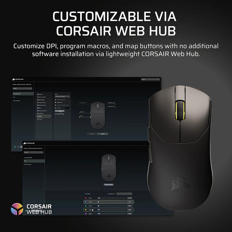 Web‑based Corsair Web Hub: άμεση ρύθμιση DPI, polling rate, μακροεντολών και πλήκτρων.