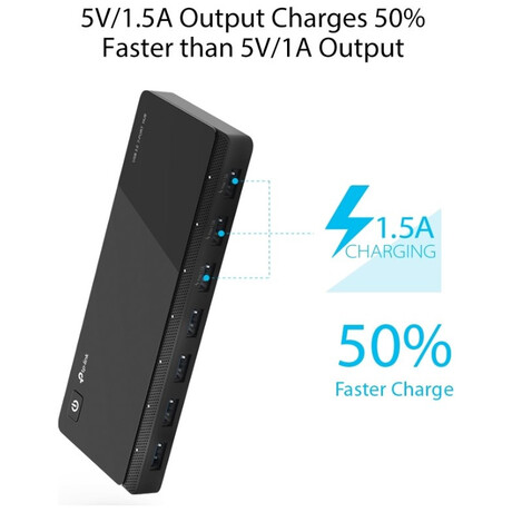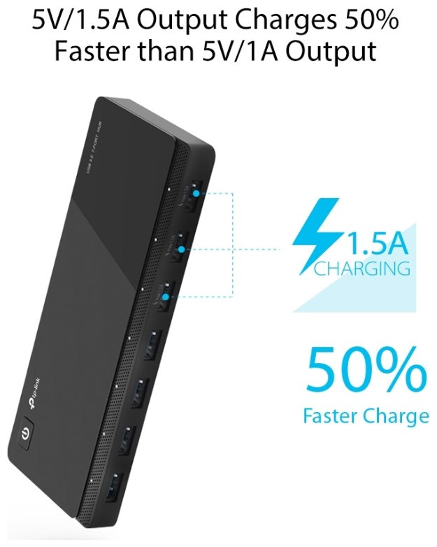 Σχεδιασμένο για γρήγορη φόρτιση. Το UH700 μπορεί να προσφέρει έξοδο έως και 5V/1,5A που φορτίζει 50% πιο γρήγορα και εξοικονομεί έως και 30% χρόνο φόρτισης*. Η πλήρης φόρτιση ενός Galaxy S6 edge διαρκεί μόλις 100 λεπτά με το UH700 USB Hub, ενώ διαρκεί 150 λεπτά με έναν διανομέα USB που υποστηρίζει έξοδο 5V/1A.*