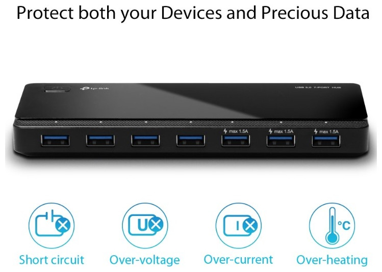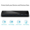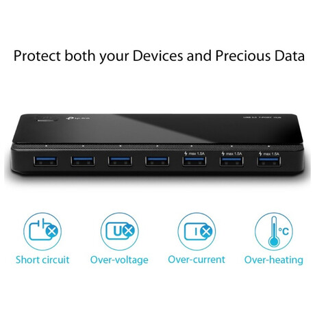 Προστατέψτε τόσο τις συσκευές όσο και τα πολύτιμα δεδομένα σας. Το UH700 έχει εξελιγμένο σχέδιο κυκλώματος με πολλαπλές προστασίες για τις συσκευές σας από υπερθέρμανση, υπερβολικό ρεύμα, υπέρταση και βραχυκύκλωμα. Ένα ενσωματωμένο προστατευτικό υπέρτασης διατηρεί τις συσκευές και τα δεδομένα σας ασφαλή κατά τη διαδικασία μεταφοράς δεδομένων. Το UH700 υποστηρίζει εναλλαγή θυρών USB που μπορούν να συνδεθούν και να αποσυνδεθούν με ασφάλεια ενώ ο υπολογιστής είναι ενεργοποιημένος και λειτουργεί.