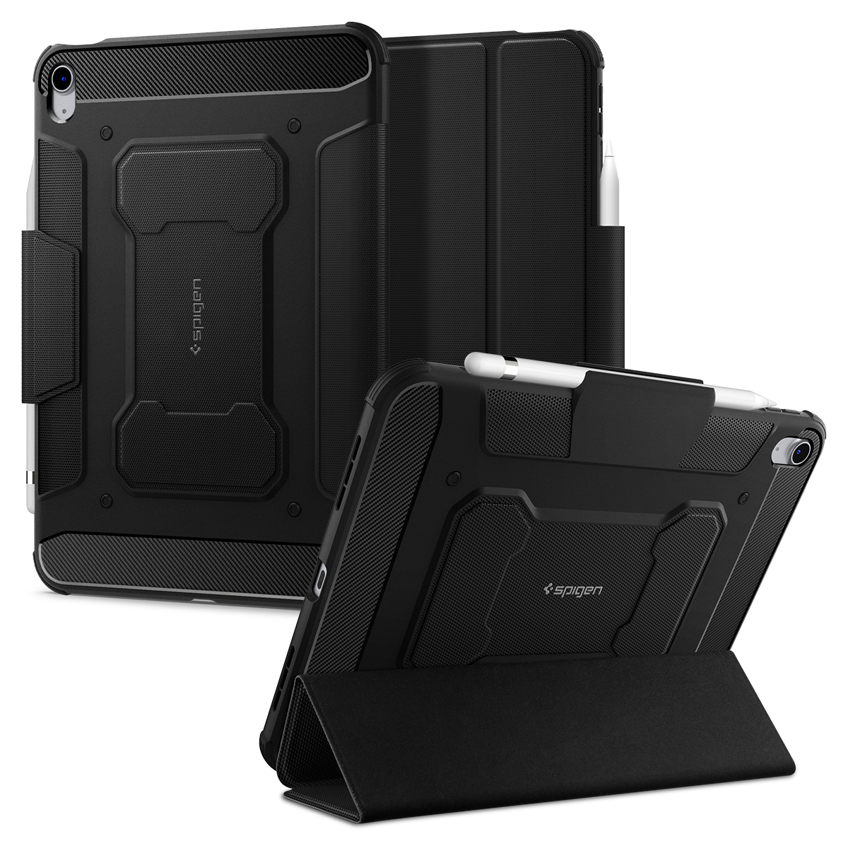 Spigen Rugged Armor Pro Case Stylish look with matte black finish Built-in kickstand for easy hands-free viewing Raised edges for screen and camera protection Mil-grade certified with Air Cushion Technology® Fully supports Apple Pencil functions Material: TPU + PU Leather
