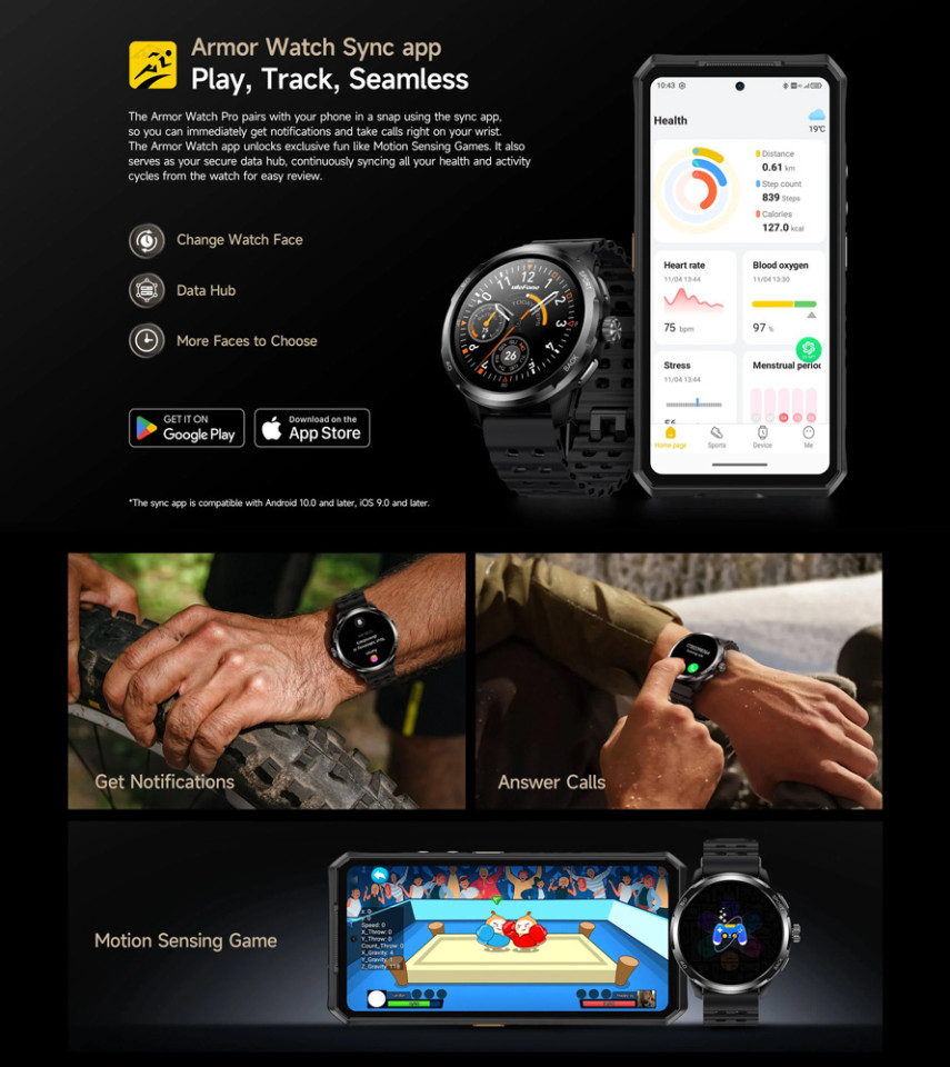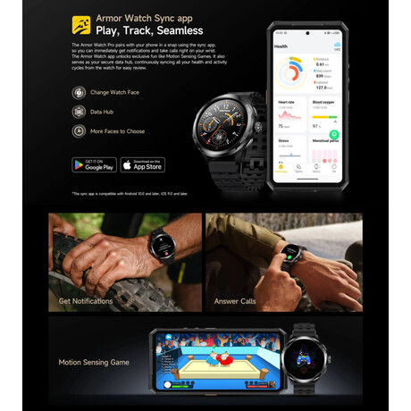 Με πιστοποιήσεις IP68, IP69K, 5ATM και MIL-STD-810H, το Armor Watch Pro είναι ιδανικό για αθλητικές δραστηριότητες, outdoor περιβάλλοντα και χρήση σε δύσκολες συνθήκες. Υποστηρίζει πάνω από 100 αθλητικά modes, συνεχή παρακολούθηση καρδιακού ρυθμού 24/7, μέτρηση οξυγόνου αίματος (SpO2), παρακολούθηση ύπνου και διαχείριση γυναικείας υγείας.