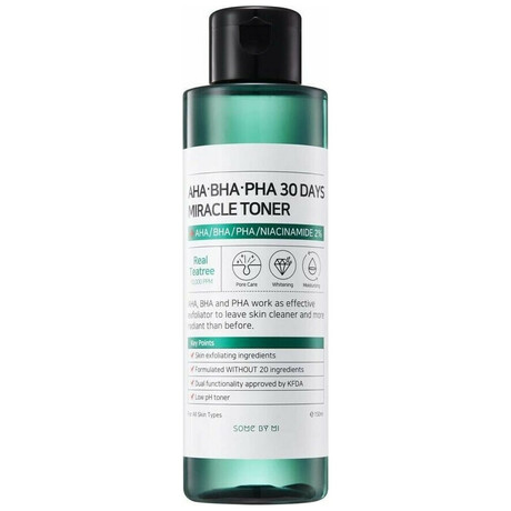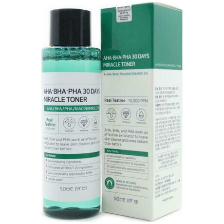 Το Some By Mi AHA BHA PHA 30 Days Miracle Toner είναι ένα πολυβραβευμένο κορεάτικο τόνερ απολέπισης που έχει σχεδιαστεί για να καθαρίζει, να εξισορροπεί και να ανανεώνει την επιδερμίδα μέσα σε 30 ημέρες. Συνδυάζει τρεις τύπους ήπιων οξέων (AHA, BHA, PHA) με εκχύλισμα τεϊόδεντρου 10.000 ppm, νιασιναμίδη και φυτικά εκχυλίσματα, προσφέροντας καθαρισμό των πόρων, απομάκρυνση των νεκρών κυττάρων και ενυδάτωση χωρίς ερεθισμούς. Η σύνθεσή του έχει pH 5.5 και είναι κατάλληλη ακόμα και για ευαίσθητα δέρματα.