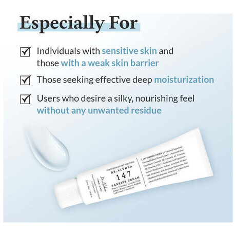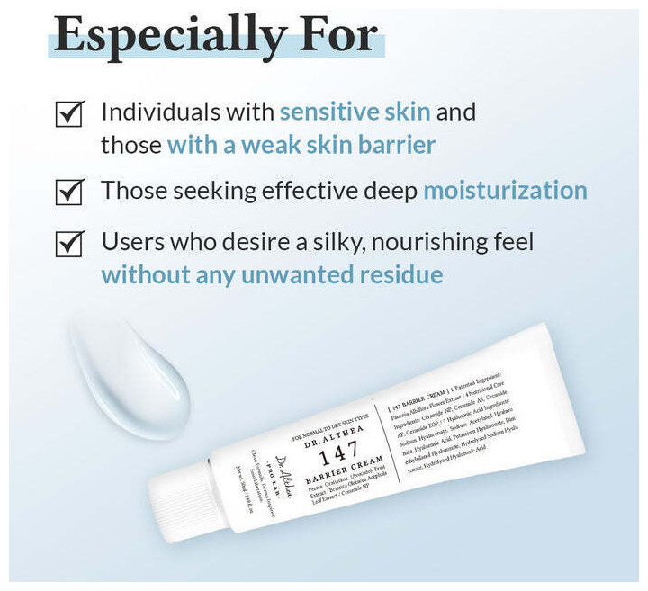 Η Dr. Althea 147 Barrier Cream αποτελεί ιδανική επιλογή για όσους αναζητούν βαθιά ενυδάτωση και ενίσχυση του δερματικού φραγμού, ιδιαίτερα σε περιπτώσεις ξηρότητας, ευαισθησίας ή ερεθισμών.