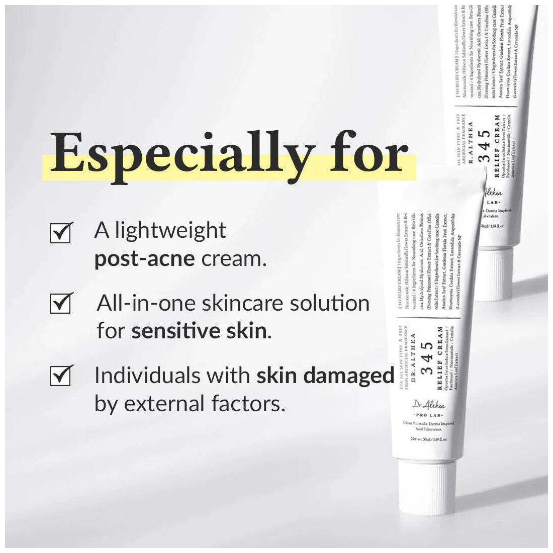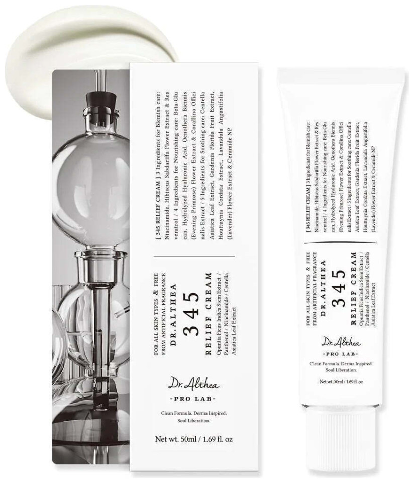 Η Dr. Althea 345 Relief Cream είναι μια καταπραϋντική και ενυδατική κρέμα σε υφή gel-ointment, ειδικά σχεδιασμένη για επιδερμίδες με ευαισθησία, τάση ακμής ή σημάδια μεταφλεγμονώδους υπερμελάγχρωσης (post-acne marks). Ο συνδυασμός νιασιναμίδης, πανθενόλης, resveratrol και φυσικών εκχυλισμάτων συμβάλλει στη μείωση της ερυθρότητας, την ενίσχυση του δερματικού φραγμού και την αποτελεσματική ενυδάτωση, χωρίς λιπαρότητα.