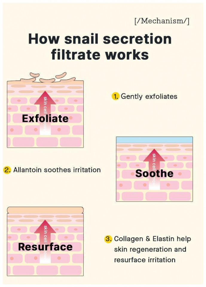 Snail Secretion Filtrate, Butylene Glycol, Glycerin, Helianthus Annuus (Sunflower) Seed Oil, 1,2-Hexanediol, Niacinamide, Water, Palmitic Acid, Arginine, Carbomer, Stearic Acid, Betaine, Cetearyl Olivate, Sorbitan Olivate, Sodium Polyacrylate, Allantoin, Tocopheryl Acetate, Panthenol, Hydroxyethyl Acrylate/Sodium Acryloyldimethyl Taurate Copolymer, Sodium Hyaluronate, Adenosine, Xanthan Gum, Myristic Acid, Copper Tripeptide-1, Acetyl Hexapeptide-8, Palmitoyl Pentapeptide-4, Palmitoyl Tripeptide-1, Palmitoyl Tetrapeptide-7