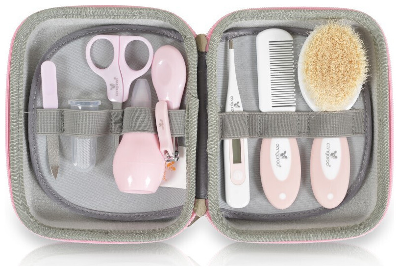 Το σετ περιλαμβάνει: οδοντόβουρτσα δακτύλων σιλικόνης, ψαλίδι, λίμα νυχιών, νυχοκόπτη, χειροκίνητη ρινική αναρρόφηση, χτένα και βούρτσα μαλλιών, ψηφιακό θερμόμετρο και θήκη μεταφοράς. Το σετ έχει σχεδιαστεί για να εξασφαλίζει τη δική σας άνεση και την άνεση του μωρού σας.