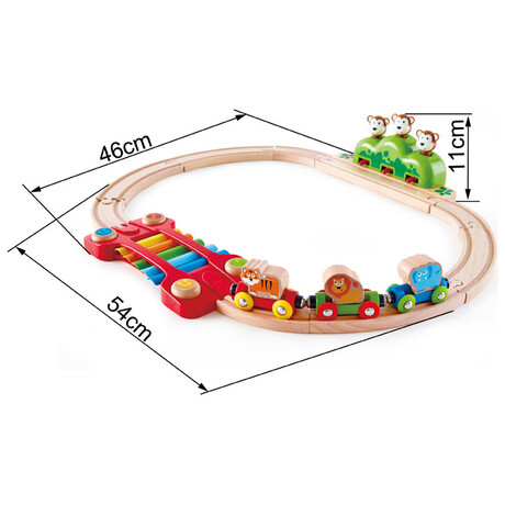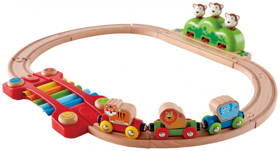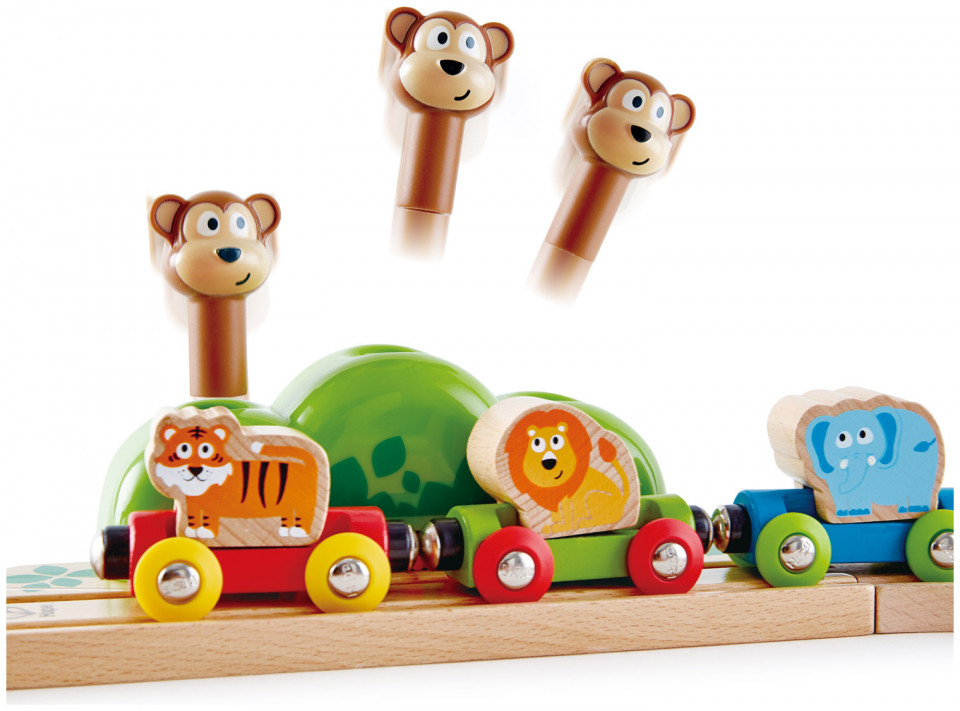 This rail set offers delights at every turn! A beautiful melody plays as you drive the jungle train over the xylophone track. Then cheeky monkeys pop up as you pass the bushes!