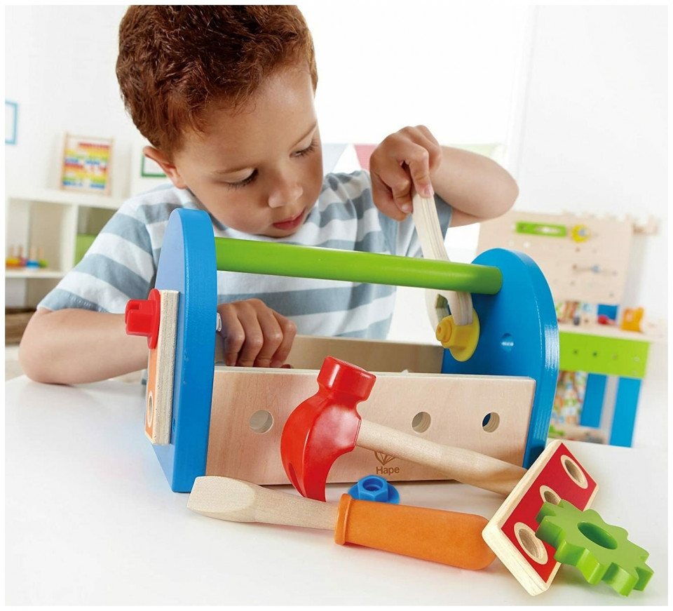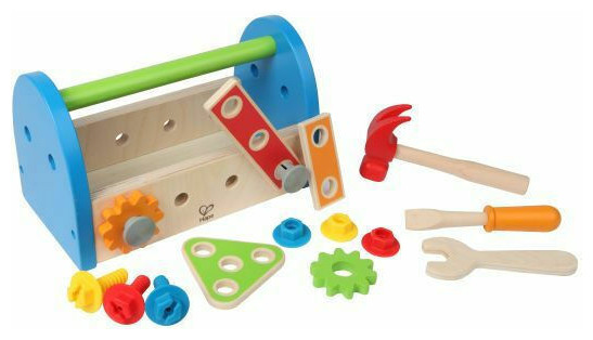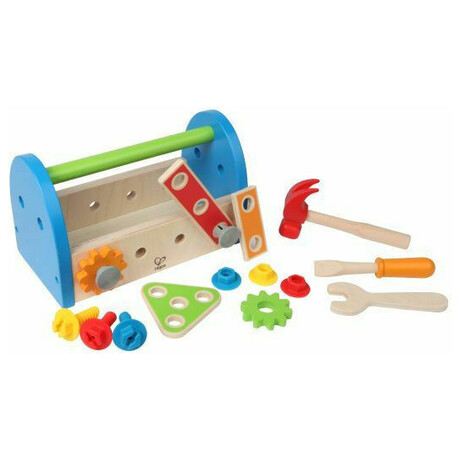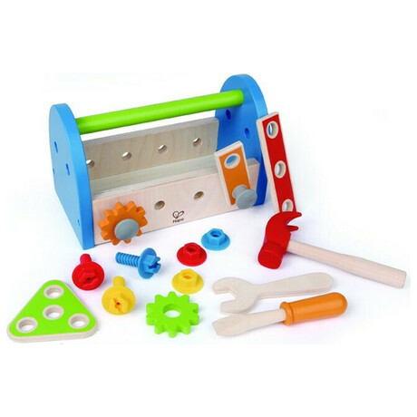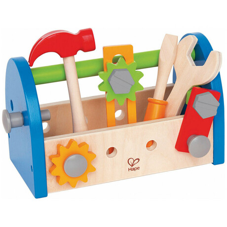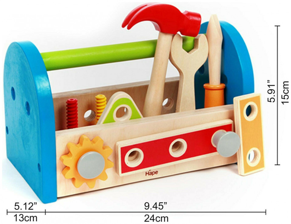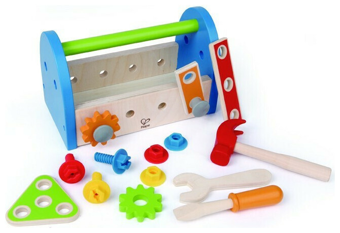 Το Hape Early Explorer Ξύλινο Κασελάκι Εργαλείων Fix It Tool Box περιέχει παξιμάδια, μπουλόνια, και όλα τα εργαλεία που χρειάζονται οι μικροί οικοδόμοι όλα συσκευασμένα σε ένα κασελάκι. Ακόμα περιλαμβάνει έναν σφιγκτήρα ,γαλλικό κλειδί, χάρακα, σφυρί, κατσαβίδι, πολλές βίδες και κομμάτια ξύλου για να εξασκήσουν τις ικανότητές τους