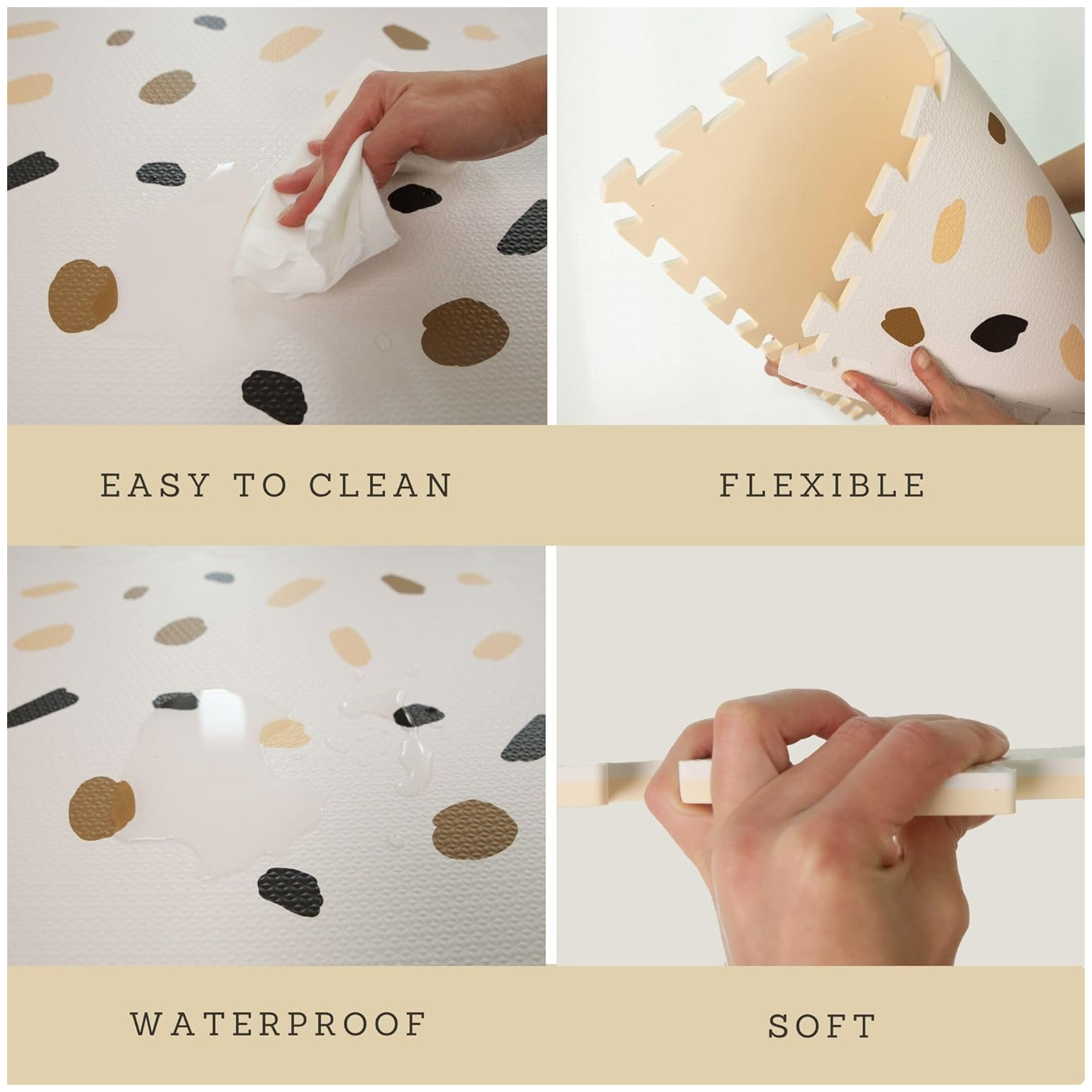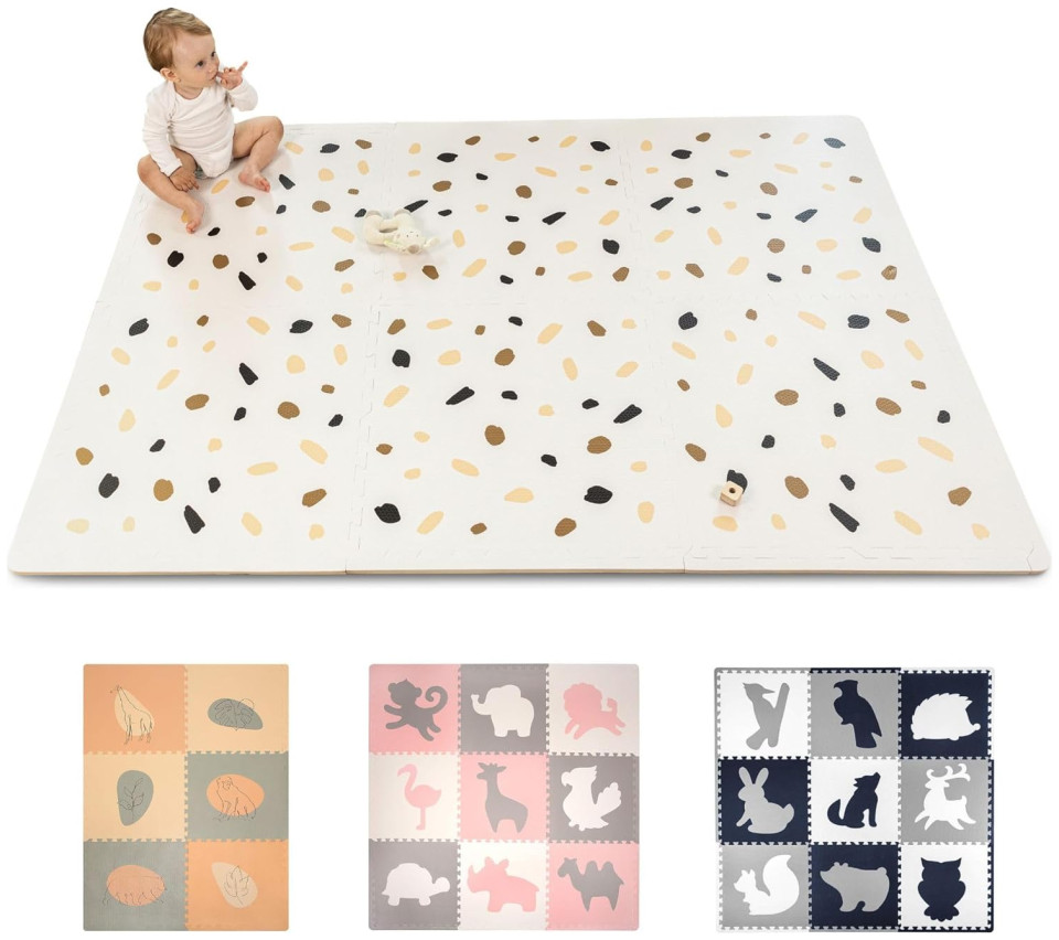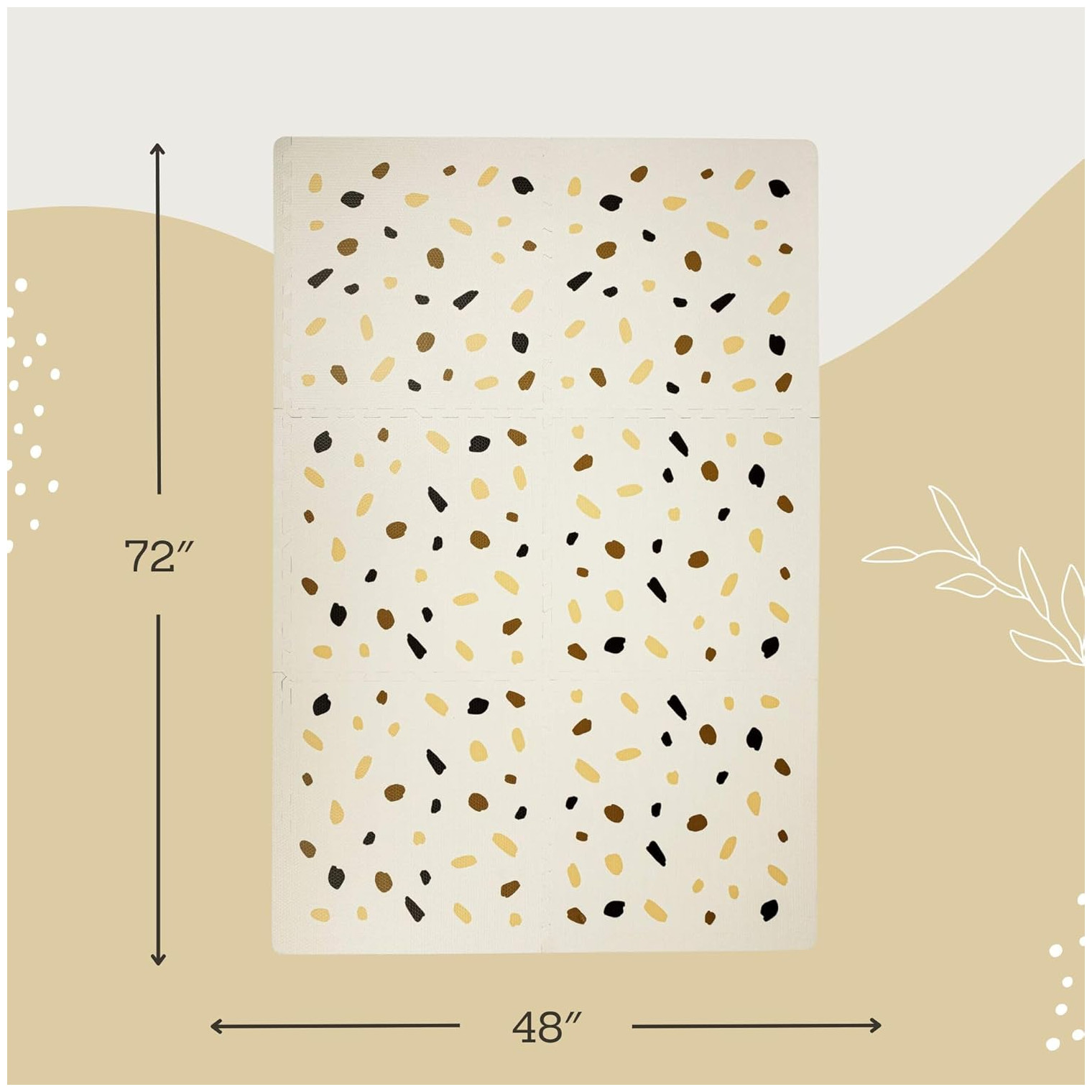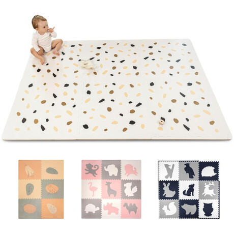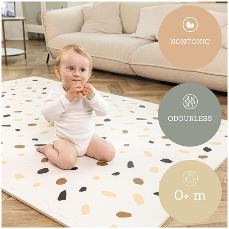 Chic European design – this baby floor mat blends seamlessly into any decor, effortlessly elevating your space. Elegant gender-neutral colors (white, beige, brown, charcoal) and minimalistic confetti design make your nursery Scandinavian cozy.