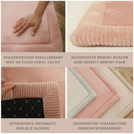 SOFT AS CLOUD FAMILY RUG consists of three layers: 1. Coral velvet for the softest skin contact, 2. High-density memory foam for comfortable playing and crawling, 3. Non-slip backing for protection against bumps when falling.