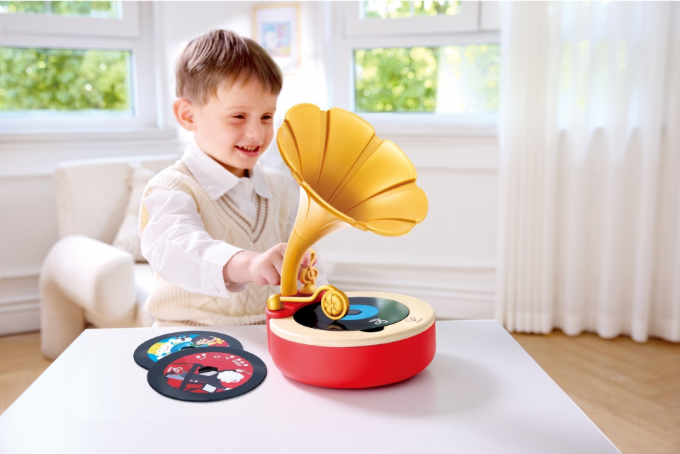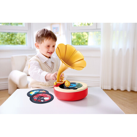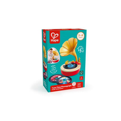 Το Hape Tune Time Phonograph είναι ένας ξύλινος φωνογράφος-παιχνίδι που εισάγει τα παιδιά στον κόσμο της μουσικής με έναν διασκεδαστικό και διαδραστικό τρόπο. Περιλαμβάνει δίσκους με προεγγεγραμμένες μουσικές επιλογές και έναν κενό δίσκο για εγγραφή ήχων. Είναι σχεδιασμένος ώστε να ενθαρρύνει τη δημιουργικότητα, την κατανόηση της μουσικής και την αίσθηση του ρυθμού.