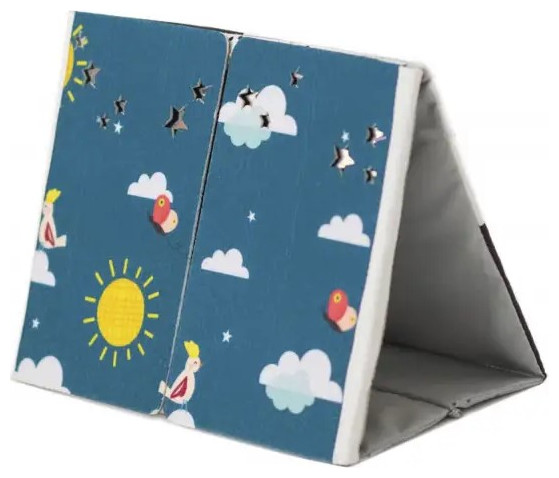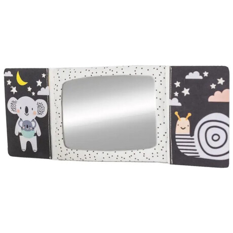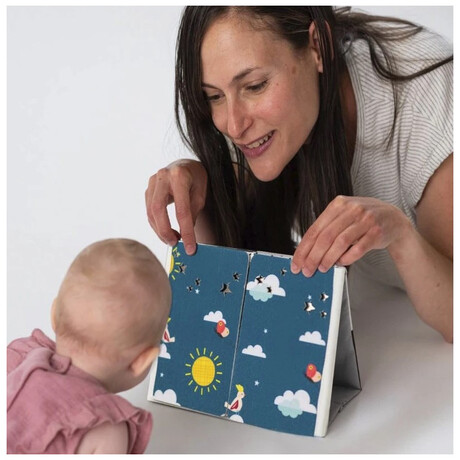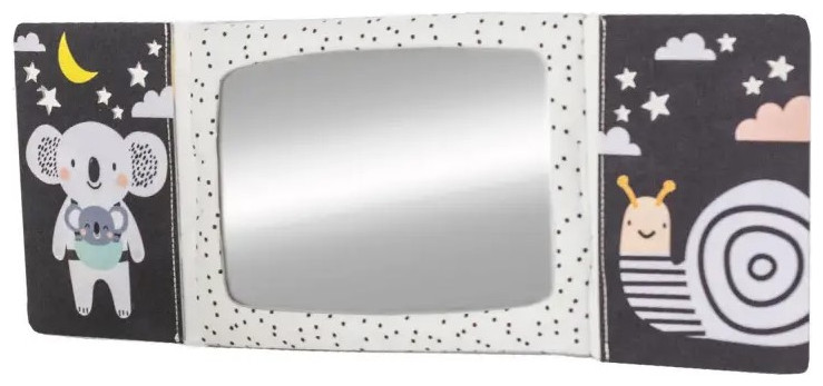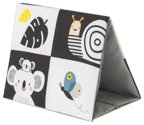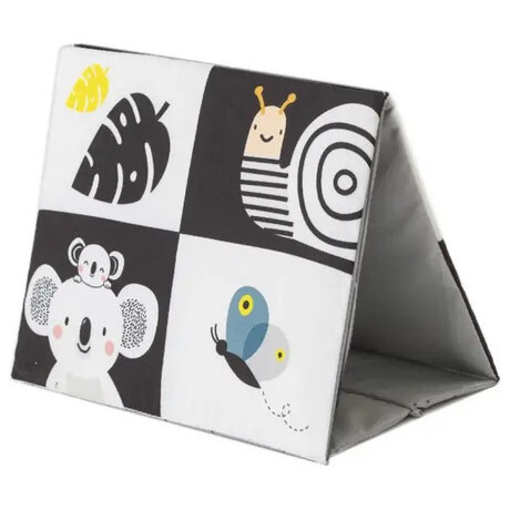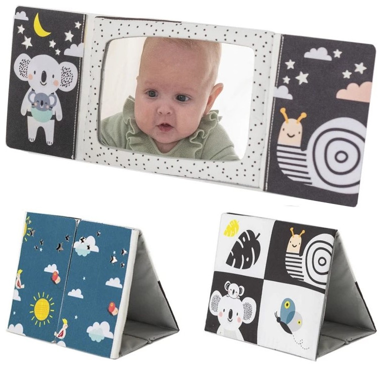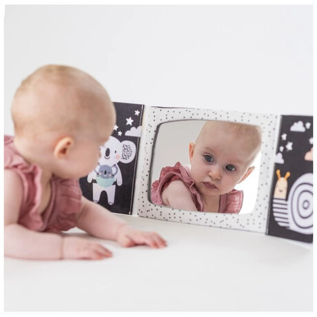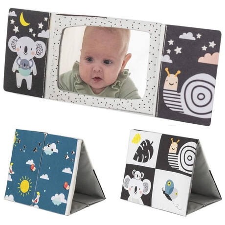 Το υφασμάτινο βιβλίο σε σχήμα επιτραπέζιου ημερολογίου είναι ιδανικό για να το τοποθετήσετε μπροστά στο παιδί ενώ παίζει στην κοιλιά του. Οι ακαταμάχητες εικόνες υψηλής αντίθεσης και ένας ασφαλής, μεγάλος καθρέφτης προσελκύουν την προσοχή του μωρού και βοηθούν το μωρό να διασκεδάζει ενώ παίζει με την κοιλιά του.Ο καθρέφτης βοηθά το παιδί να μάθει την αυτογνωσία και διεγείρει την ανάπτυξη της όρασης και των επικοινωνιακών του δεξιοτήτων. Ο καθρέφτης που καλύπτεται από πτερύγια βιβλίων μπορεί επίσης να χρησιμοποιηθεί για το δημοφιλές παιχνίδι γονέα-παιδιού του κρυφτού Peek-A-Boo.Το βιβλίο προσφέρει δύο τύπους εικόνων για δύο αναπτυξιακά στάδια του παιδιού: