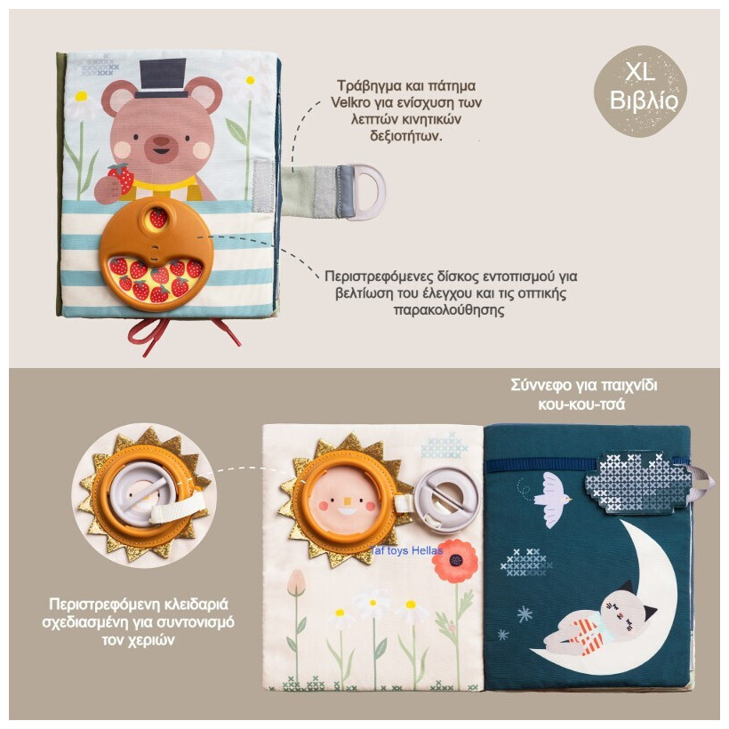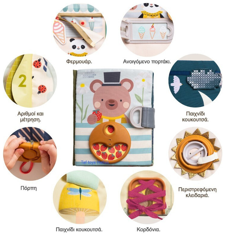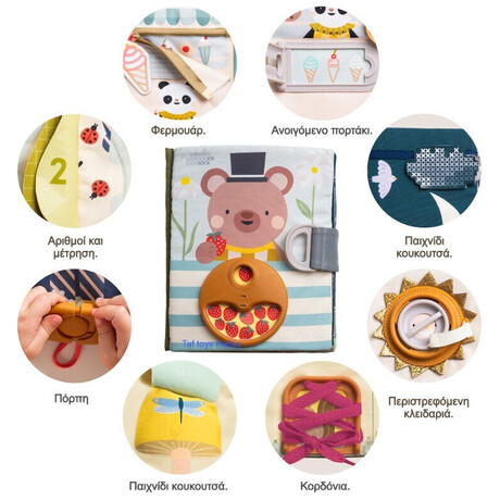 να διαδραστικό βιβλίο δραστηριοτήτων για μωρά από 18 μηνών και άνω, που περιλαμβάνει 15 διαφορετικές ασχολίες για ενίσχυση των κινητικών δεξιοτήτων και εκμάθηση εννοιών όπως αντίθετα, χρώματα και αριθμοί. Ιδανικό για ταξίδια, προσφέρει ψυχαγωγία χωρίς οθόνες και ενθαρρύνει την ανάπτυξη της ανεξαρτησίας και της δημιουργικότητας.